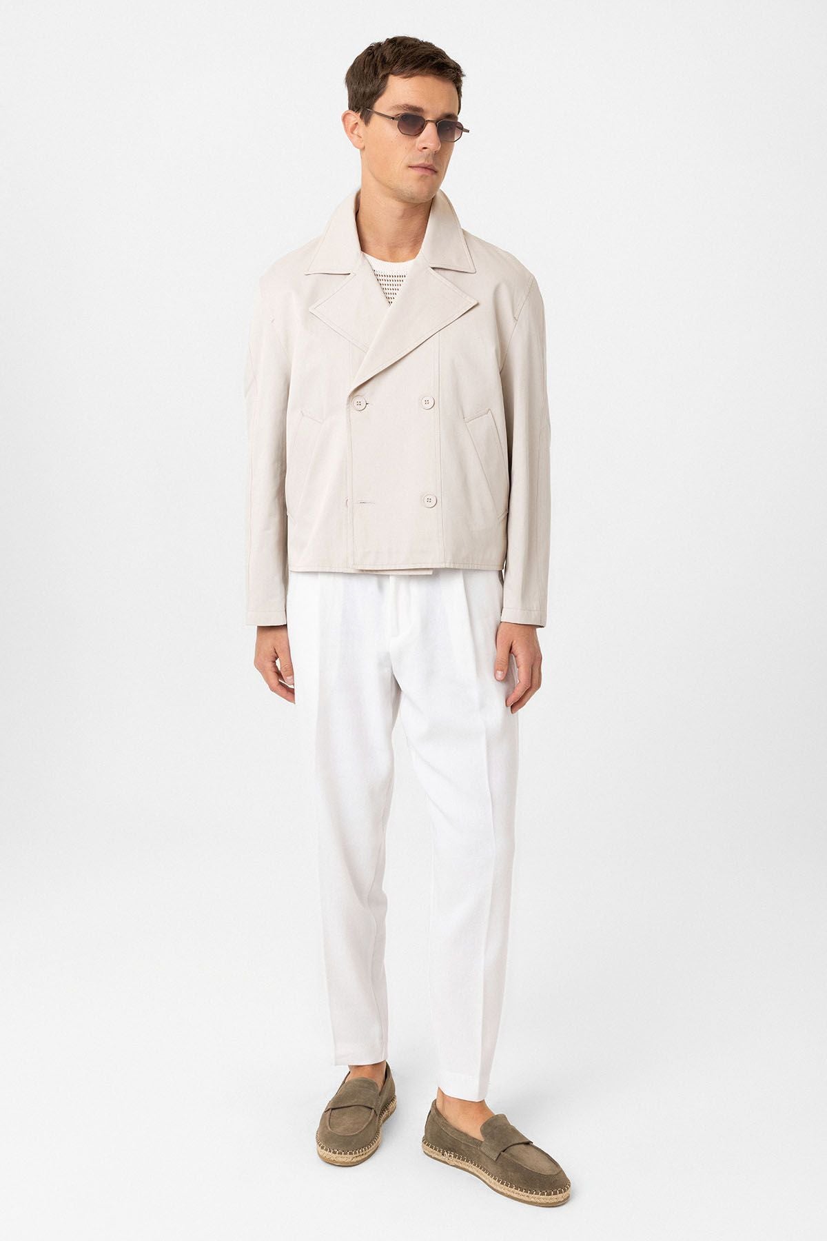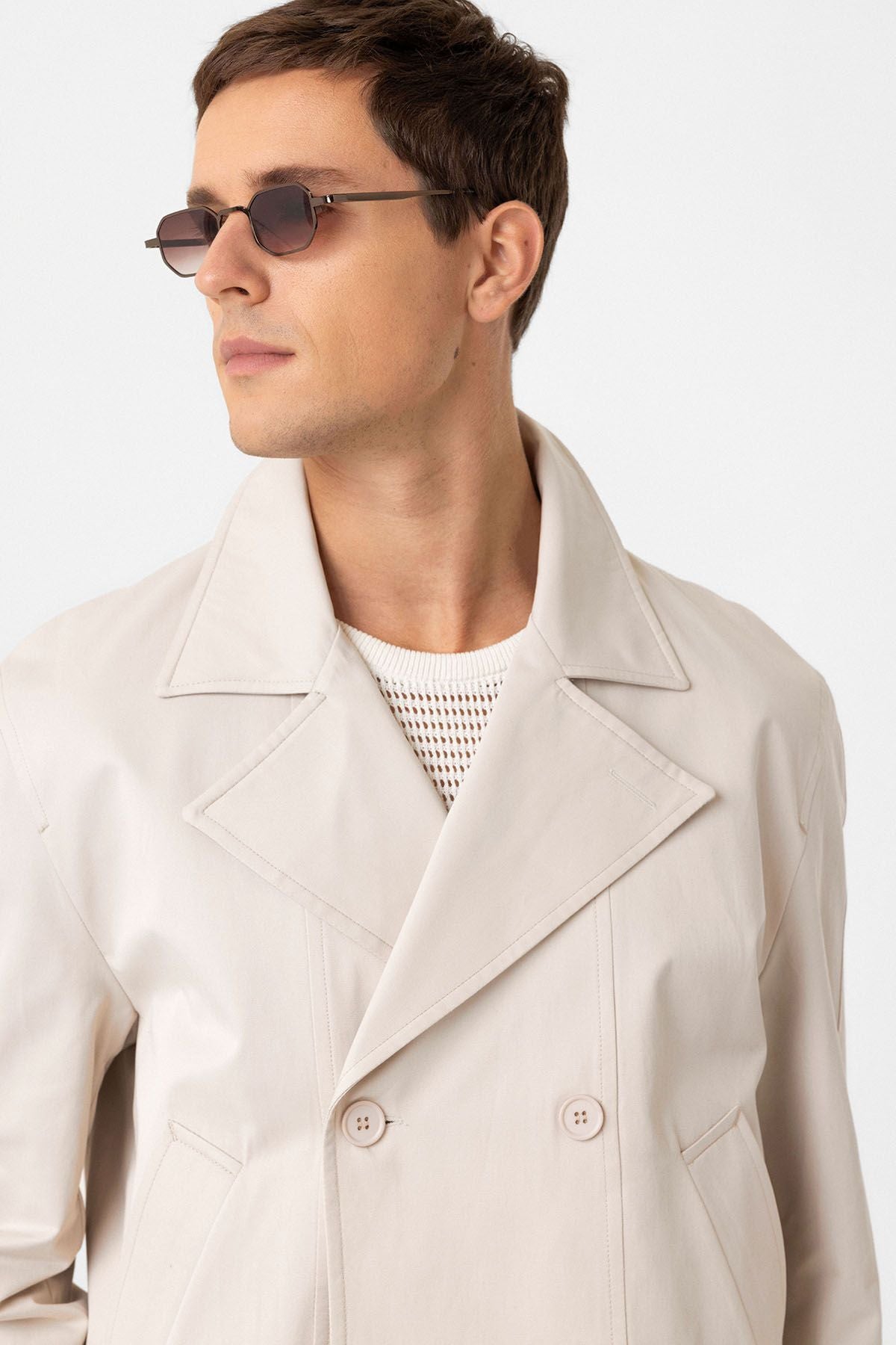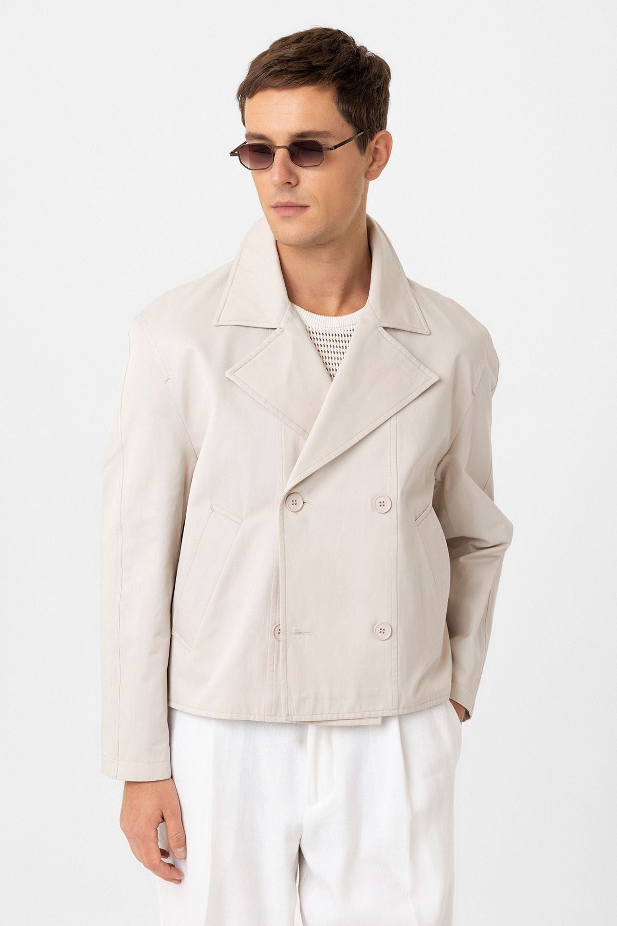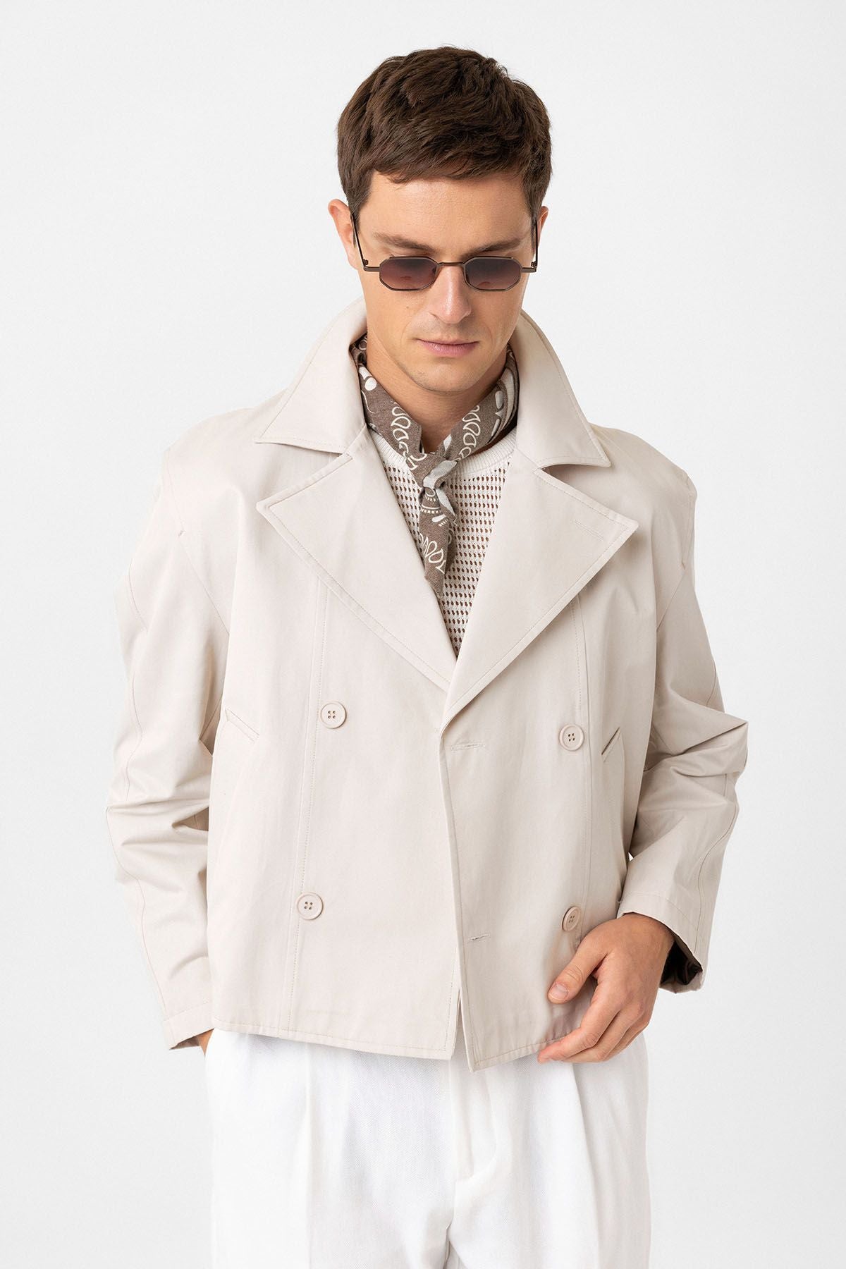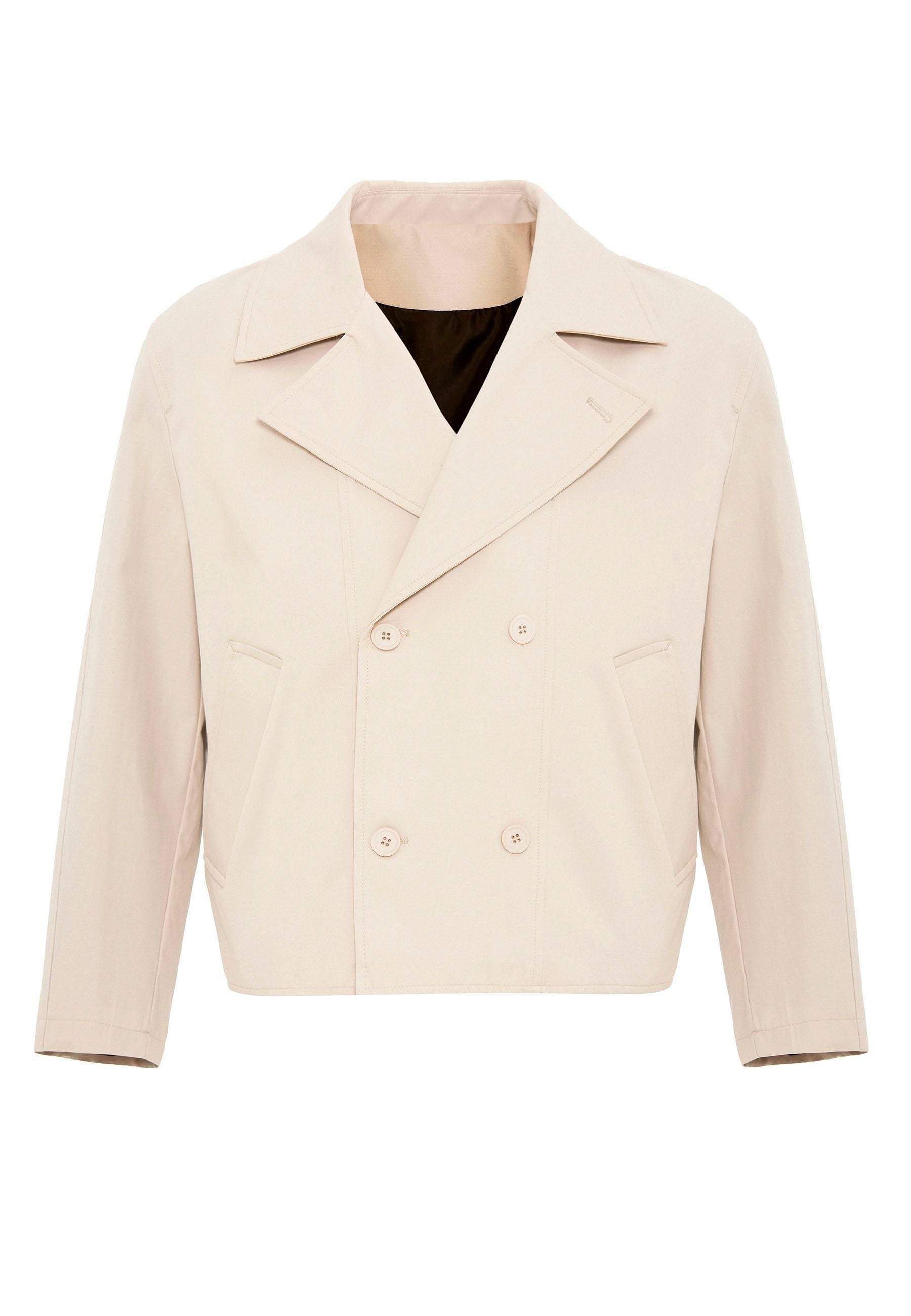 Relaxed Fit, Cropped, Double Breasted Trench Coat. Material 50% Cotton 50% Polyester. Do not tumble dry, Dry clean only, do not wash, Do not iron, do not bleach. Machine wash at 30°C. Our Model is 185 cm tall and is wearing size M
