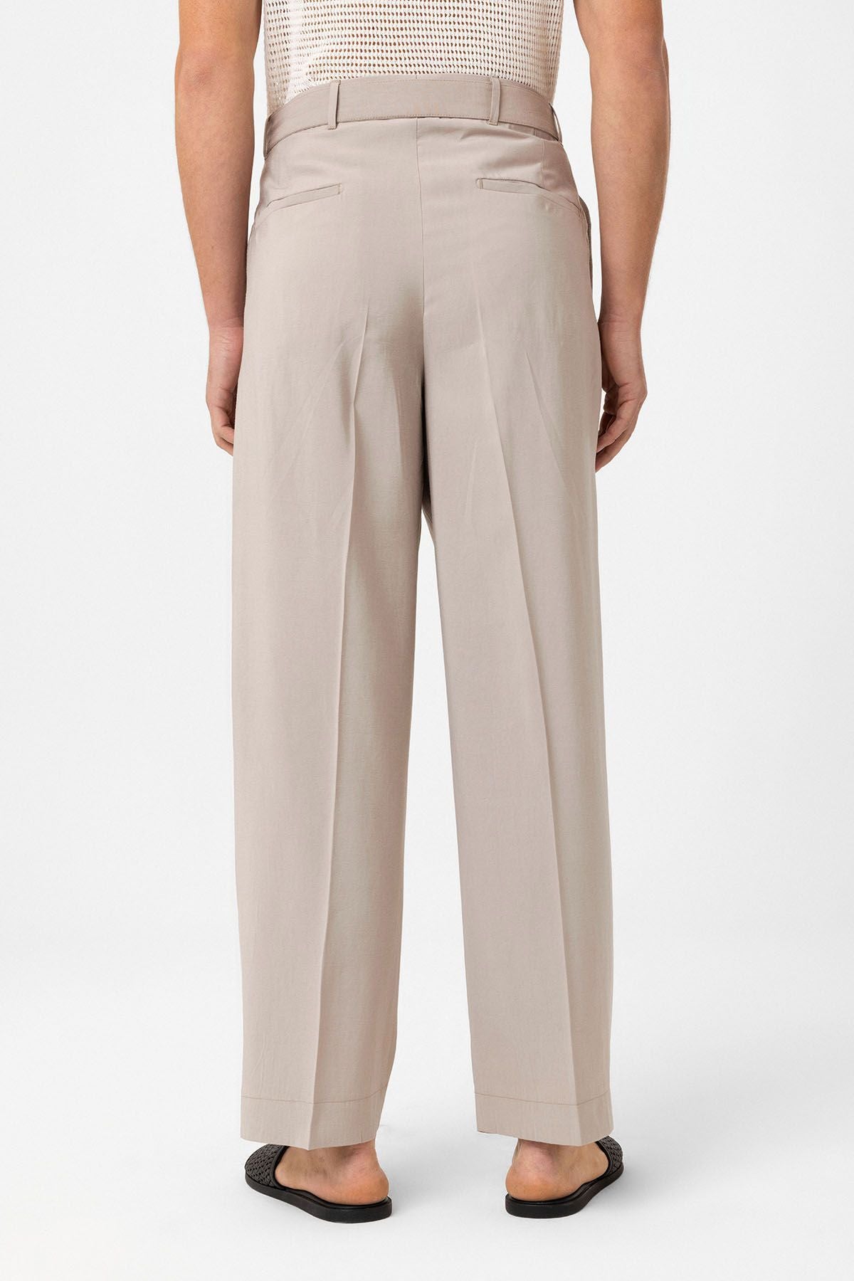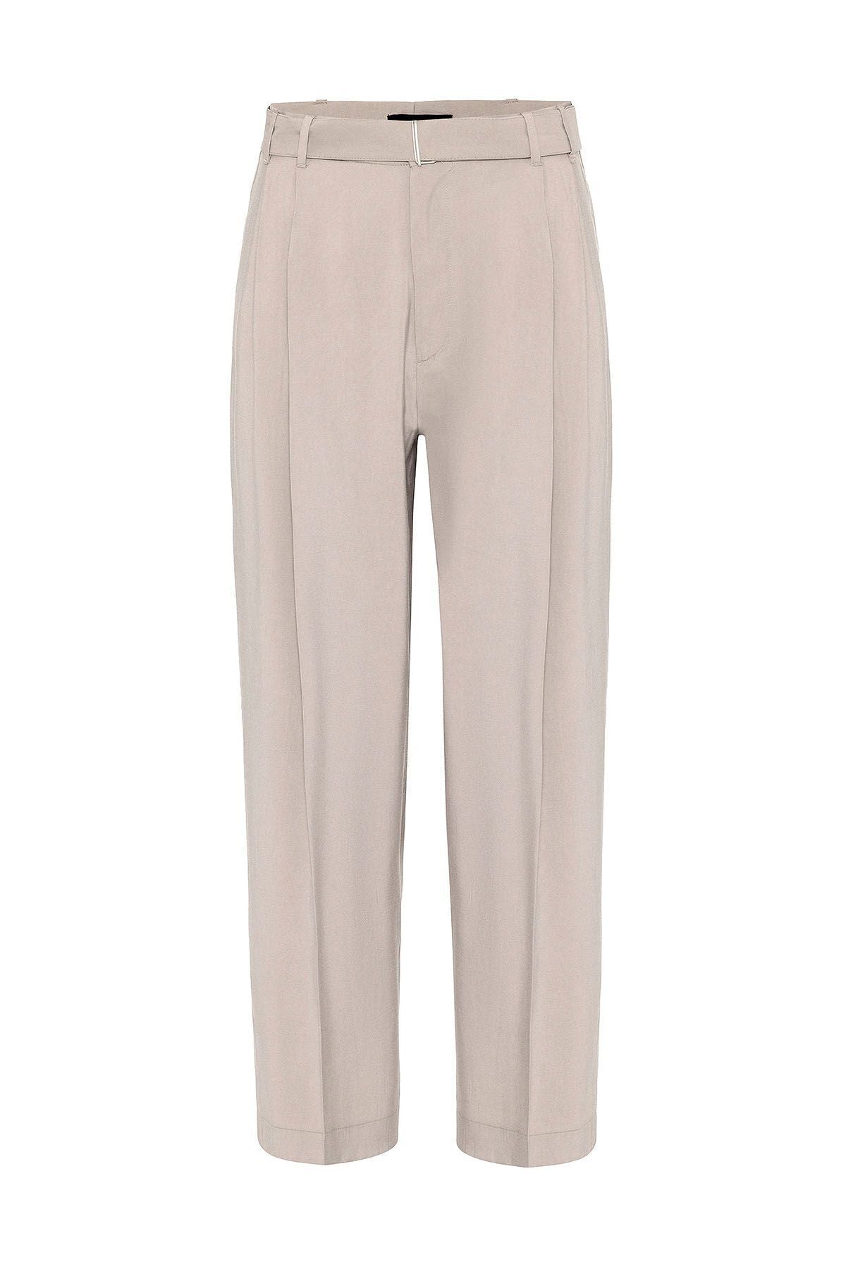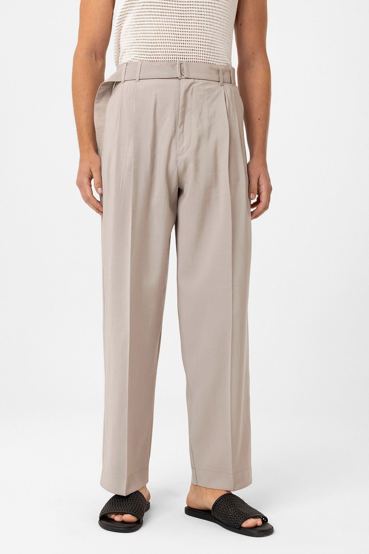 Relax Fit, Belt Detailed, Hight Waist Trousers. Material 90% Modal 10% Nylon. Do not tumble dry, machine wash at 30°C. Our Model is 188 cm tall and is wearing size M