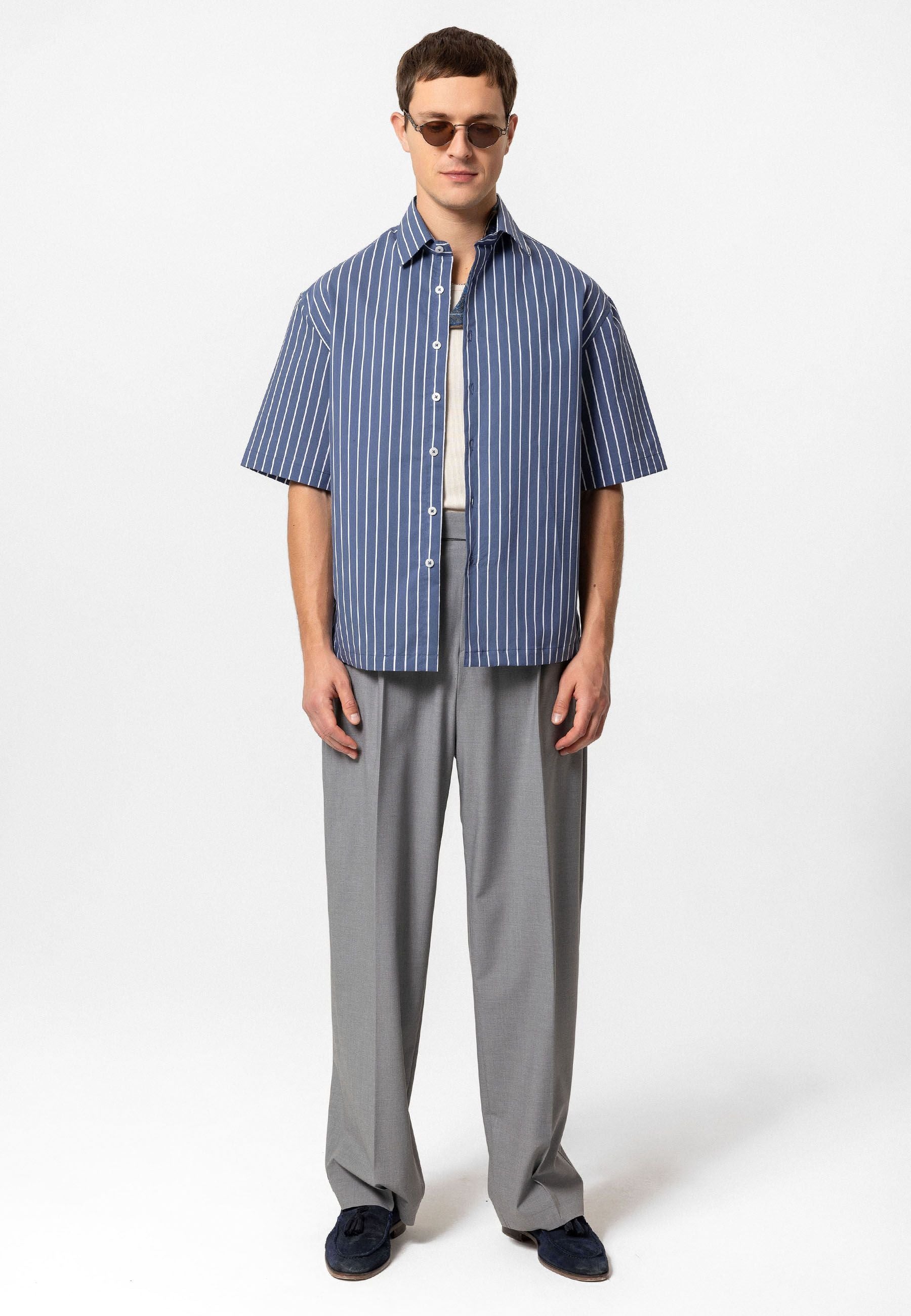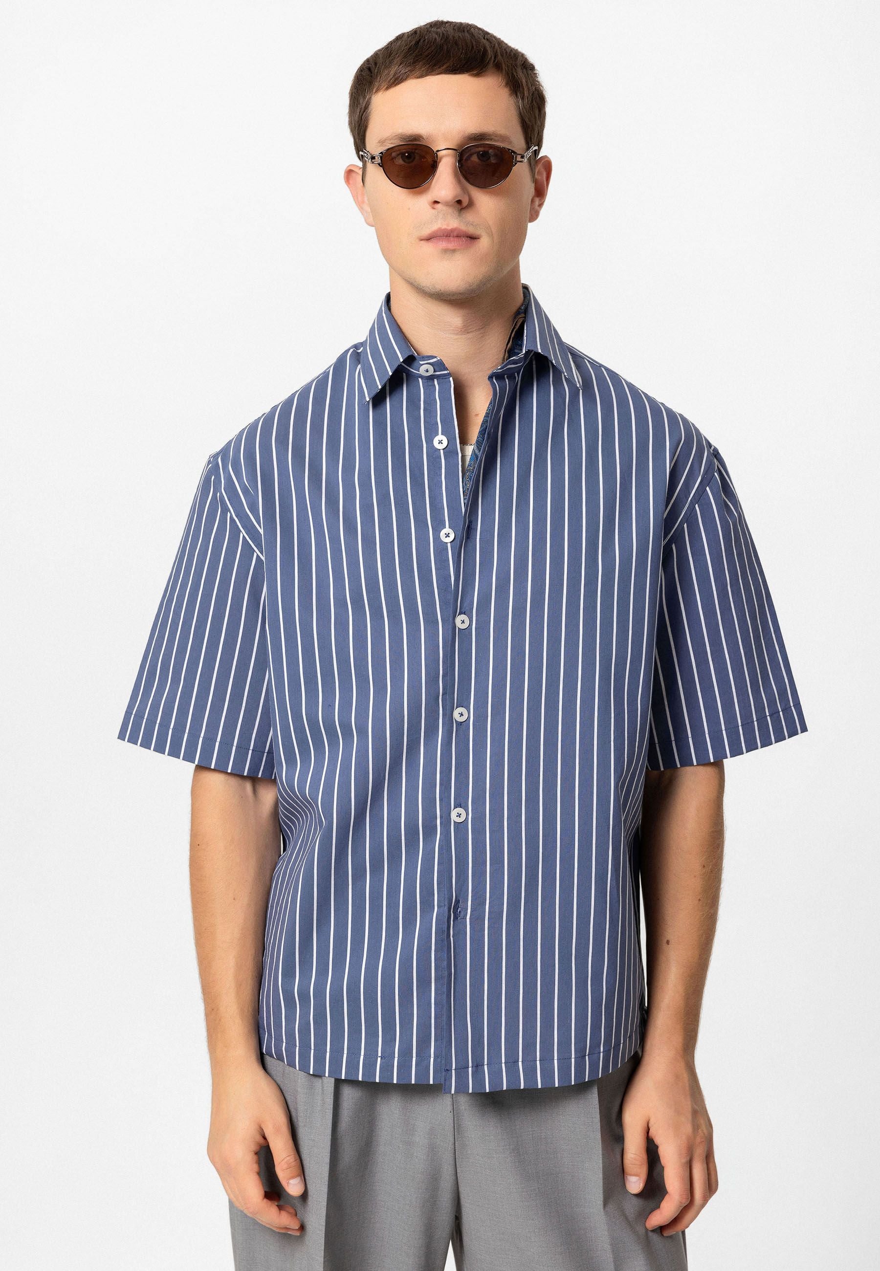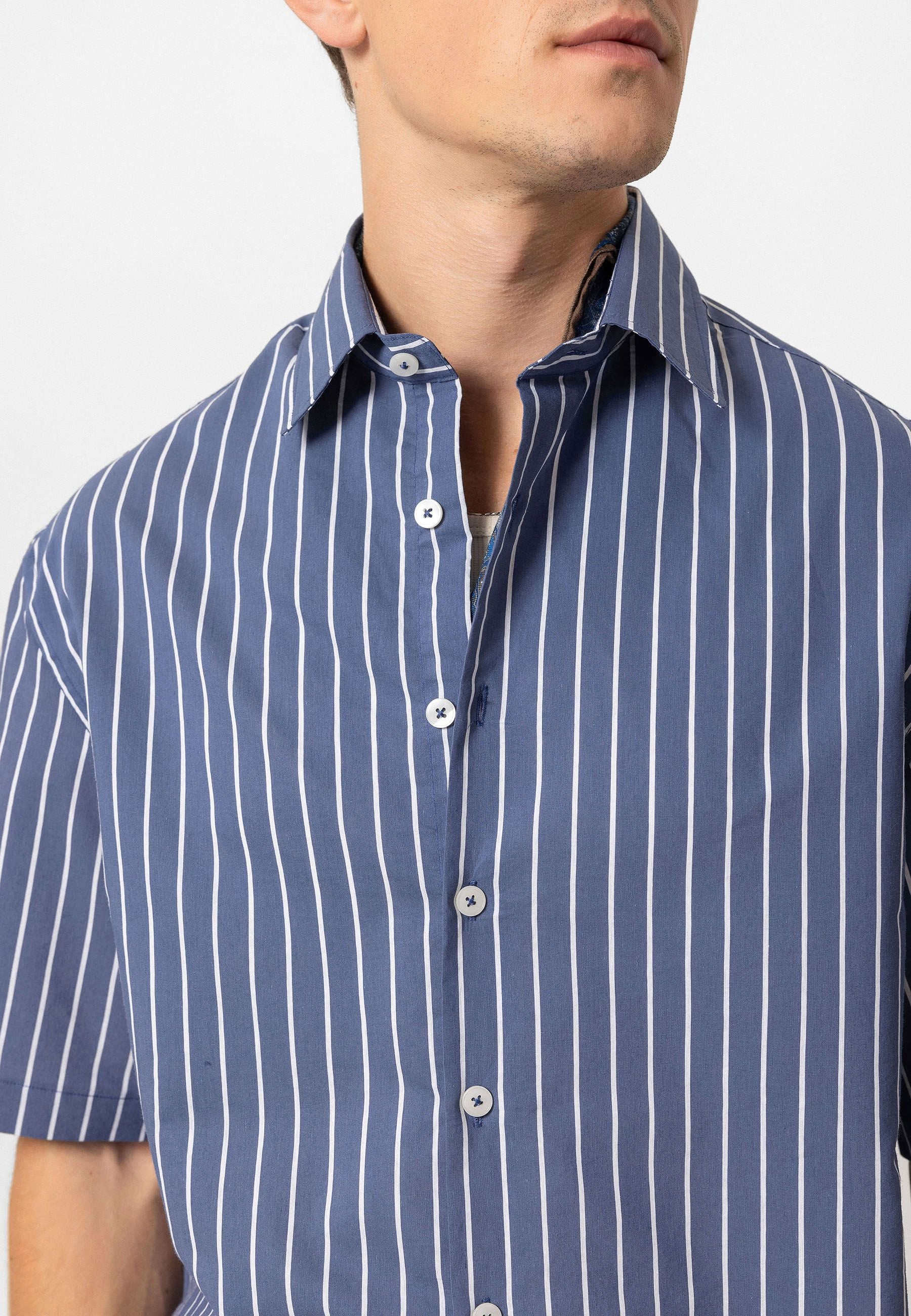 Striped, Short Sleeve, Relaxed Fit Shirt. Material 93% Cotton 7% Polyester. Machine wash at 30°C. Our model is 188 cm tall and is wearing size M