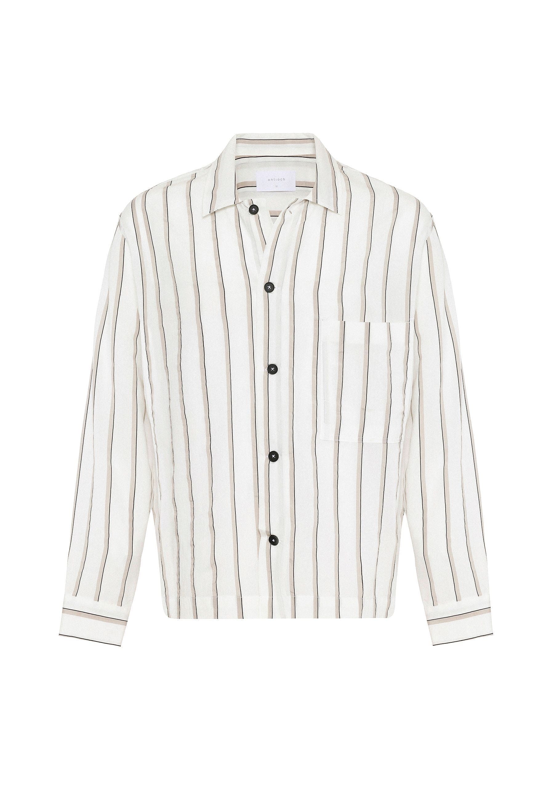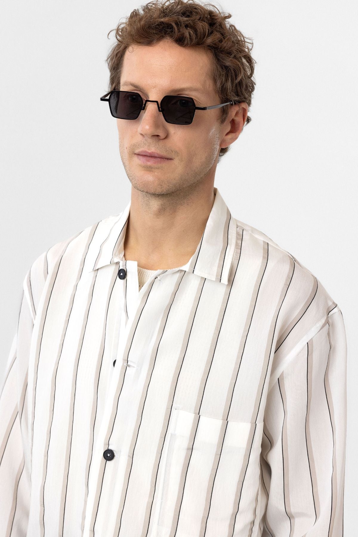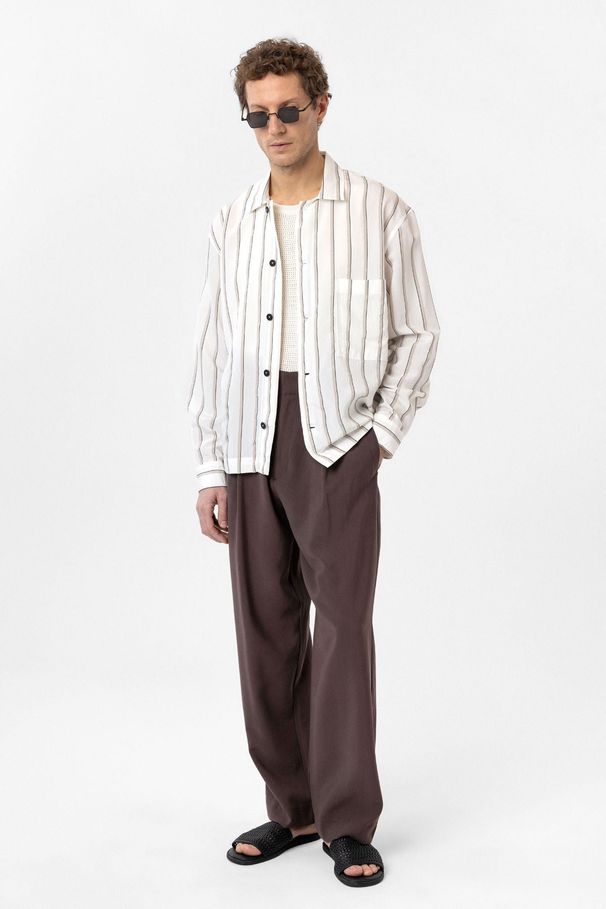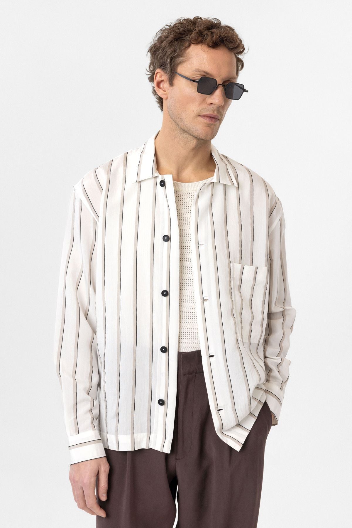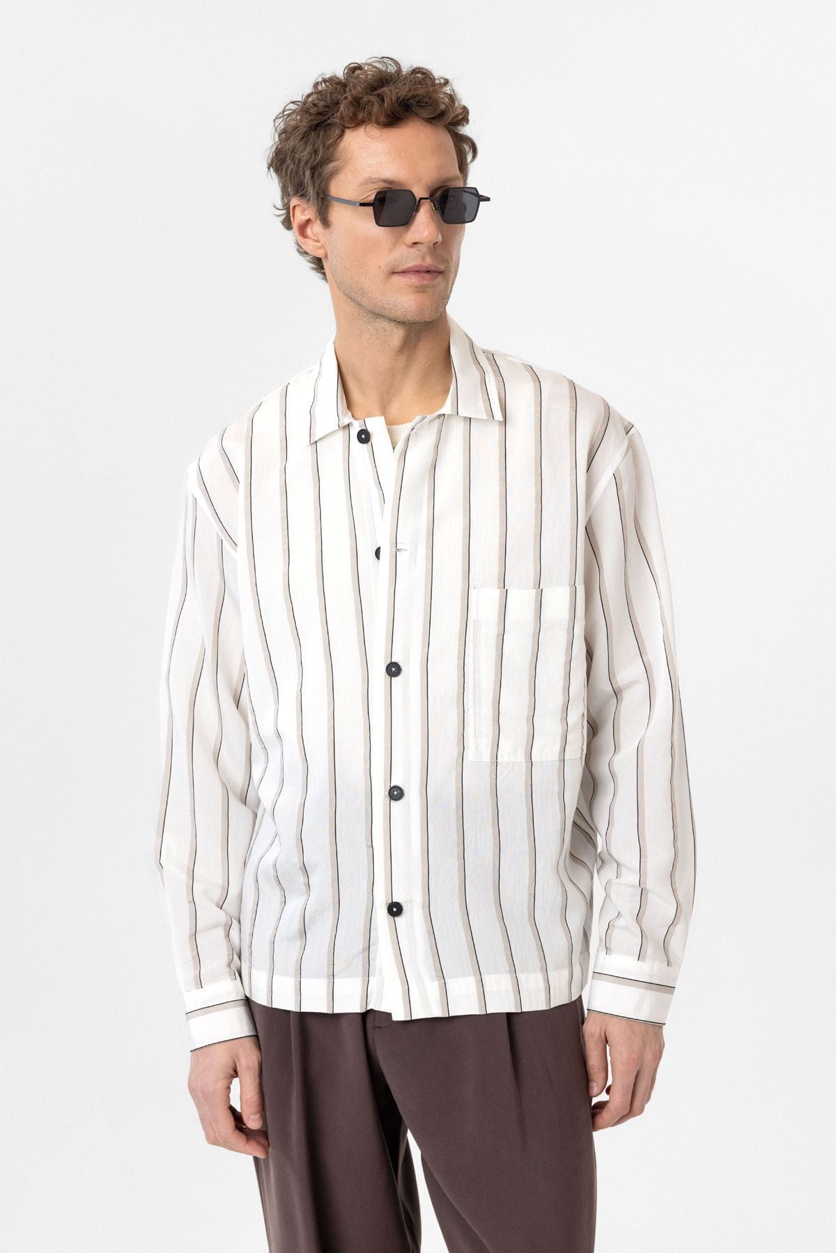 Striped, Long Sleeve, Lapel Collar Shirt. Material 85% Viscose 15% Nylon. Machine wash at 30°C. Our Model is 186 cm tall and is wearing size M