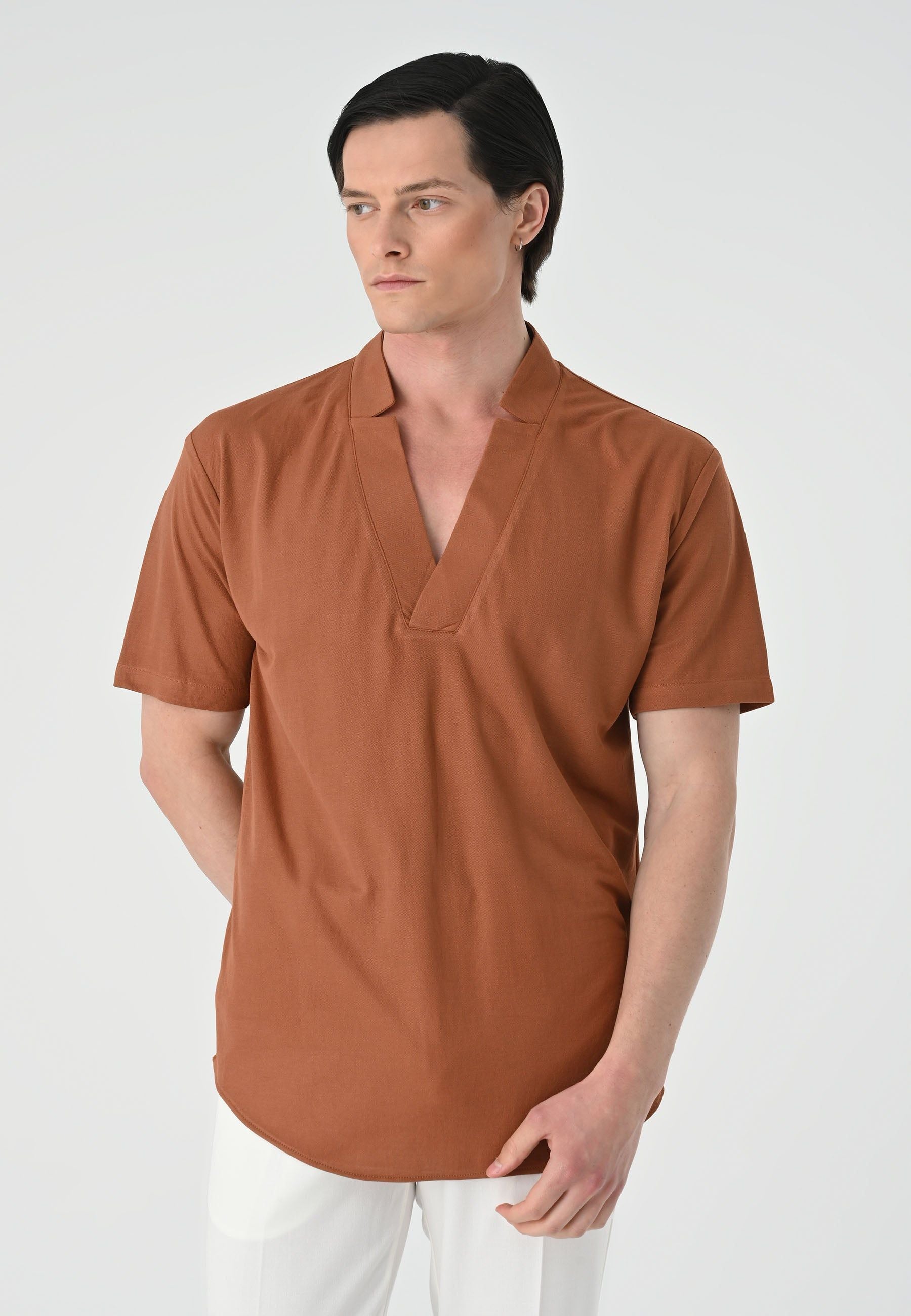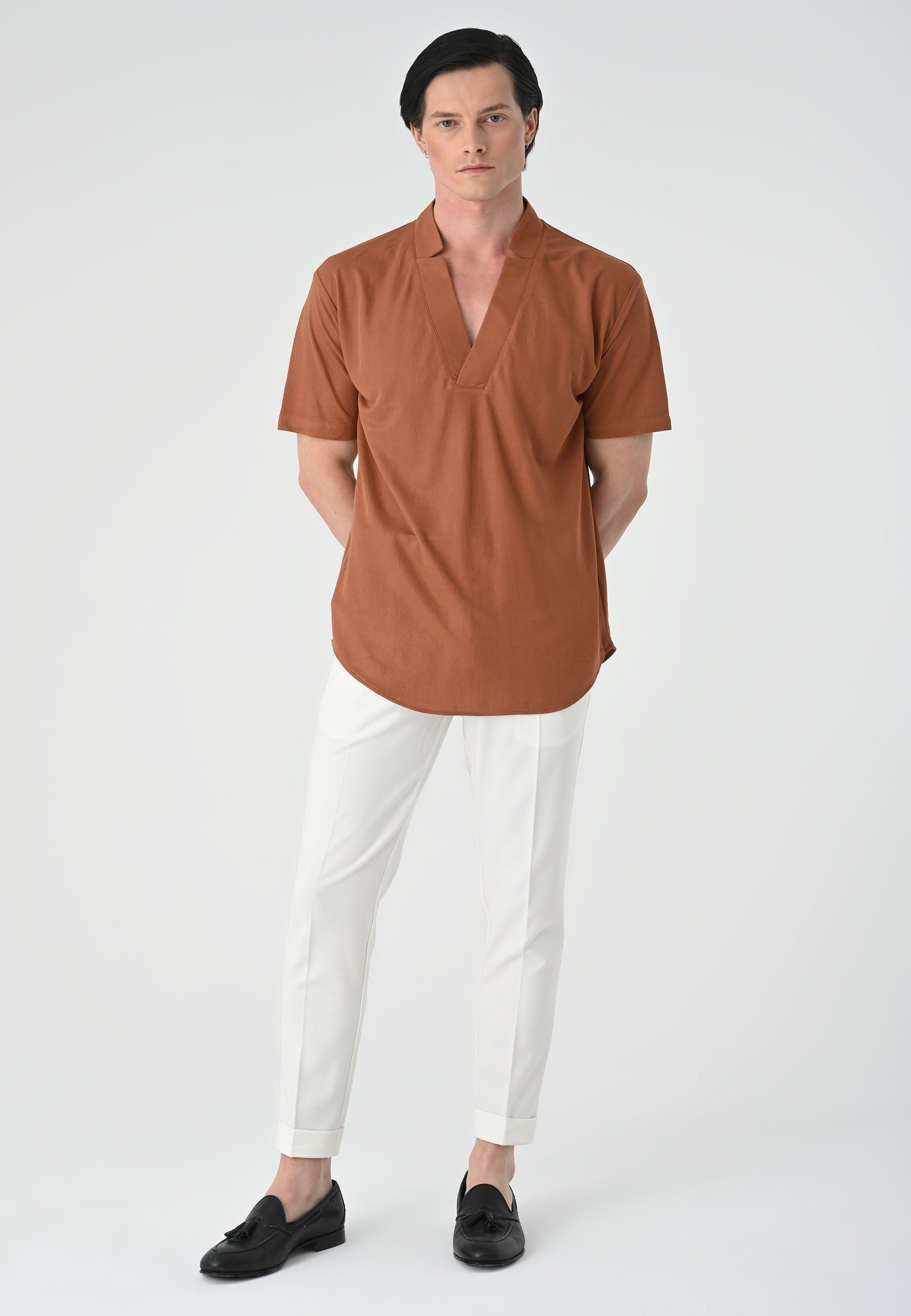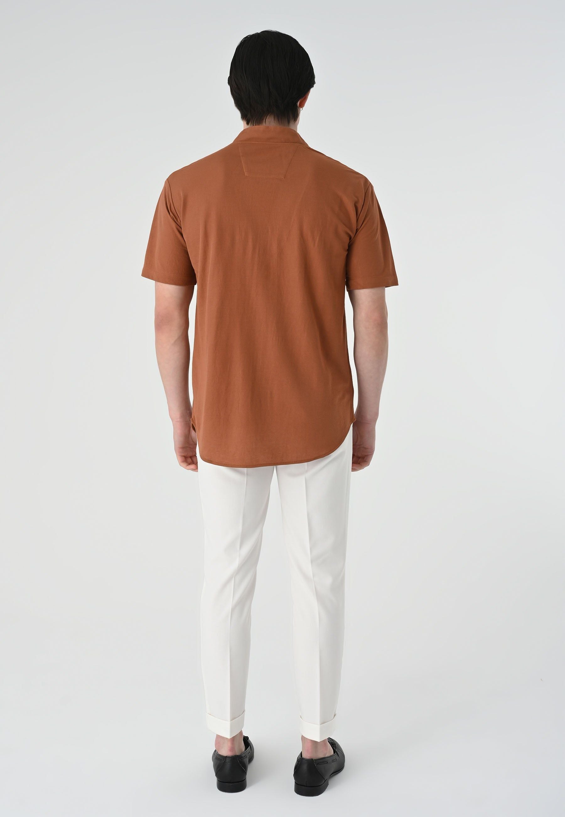 High Collar Short Sleeve Shirt. Material 100% Cotton. Machine wash at 30°C. Our model is 186 cm tall and is wearing size M