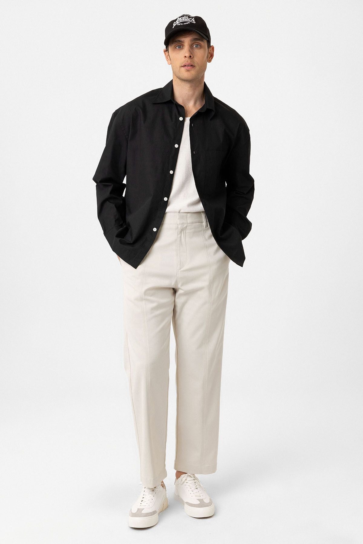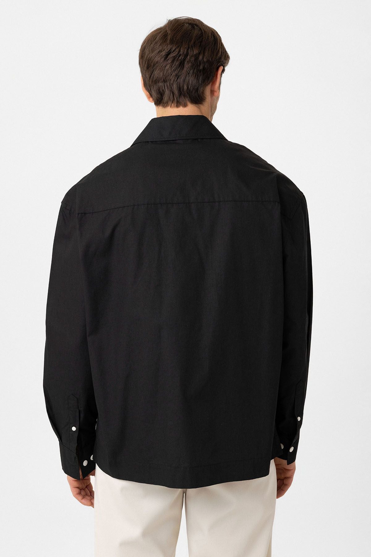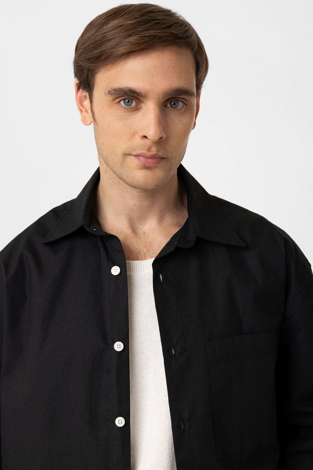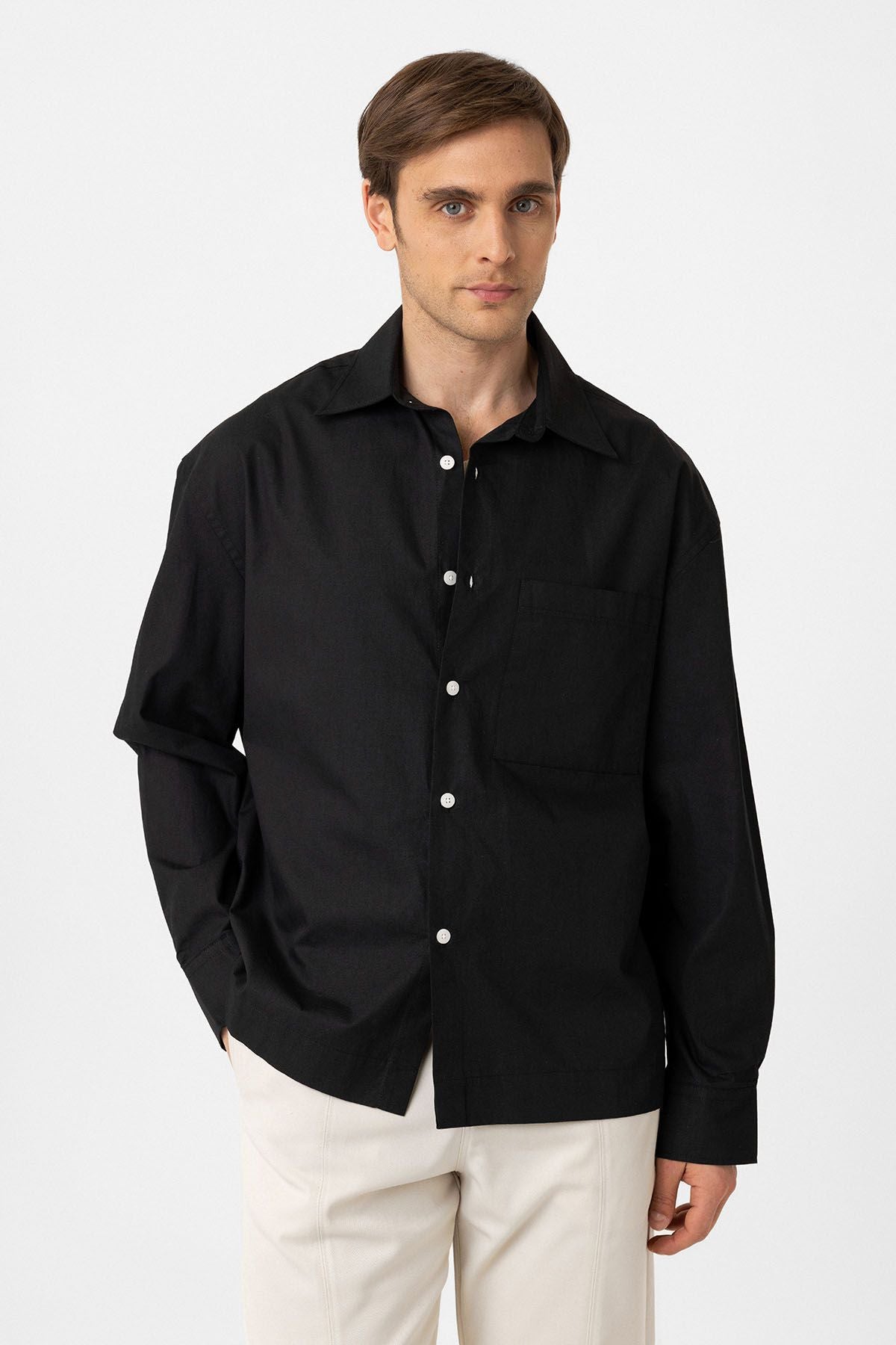 Long Sleeve, Kent Collar, Loose Fit Shirt. Material 100% Cotton. Machine wash at 30°C. Our Model is 185 cm tall and is wearing size M,