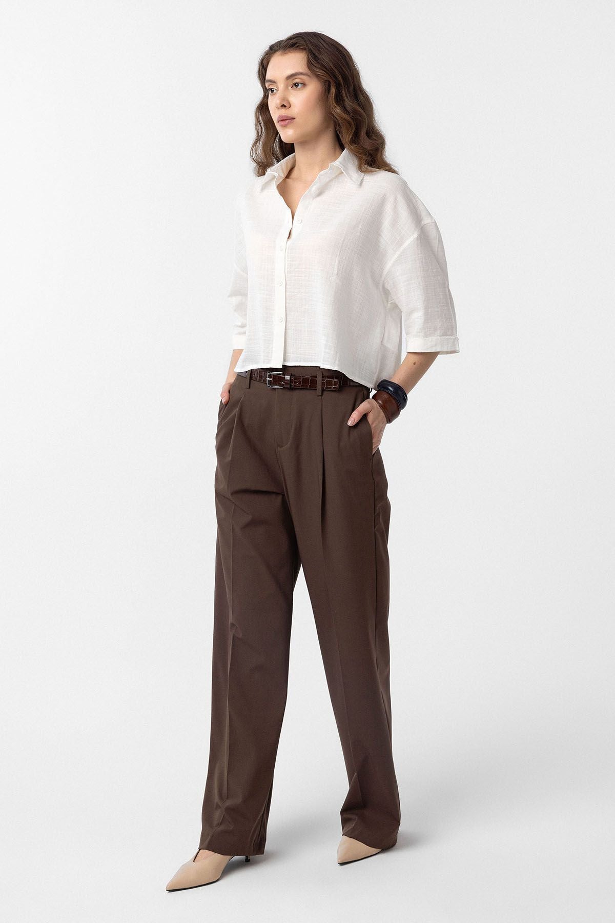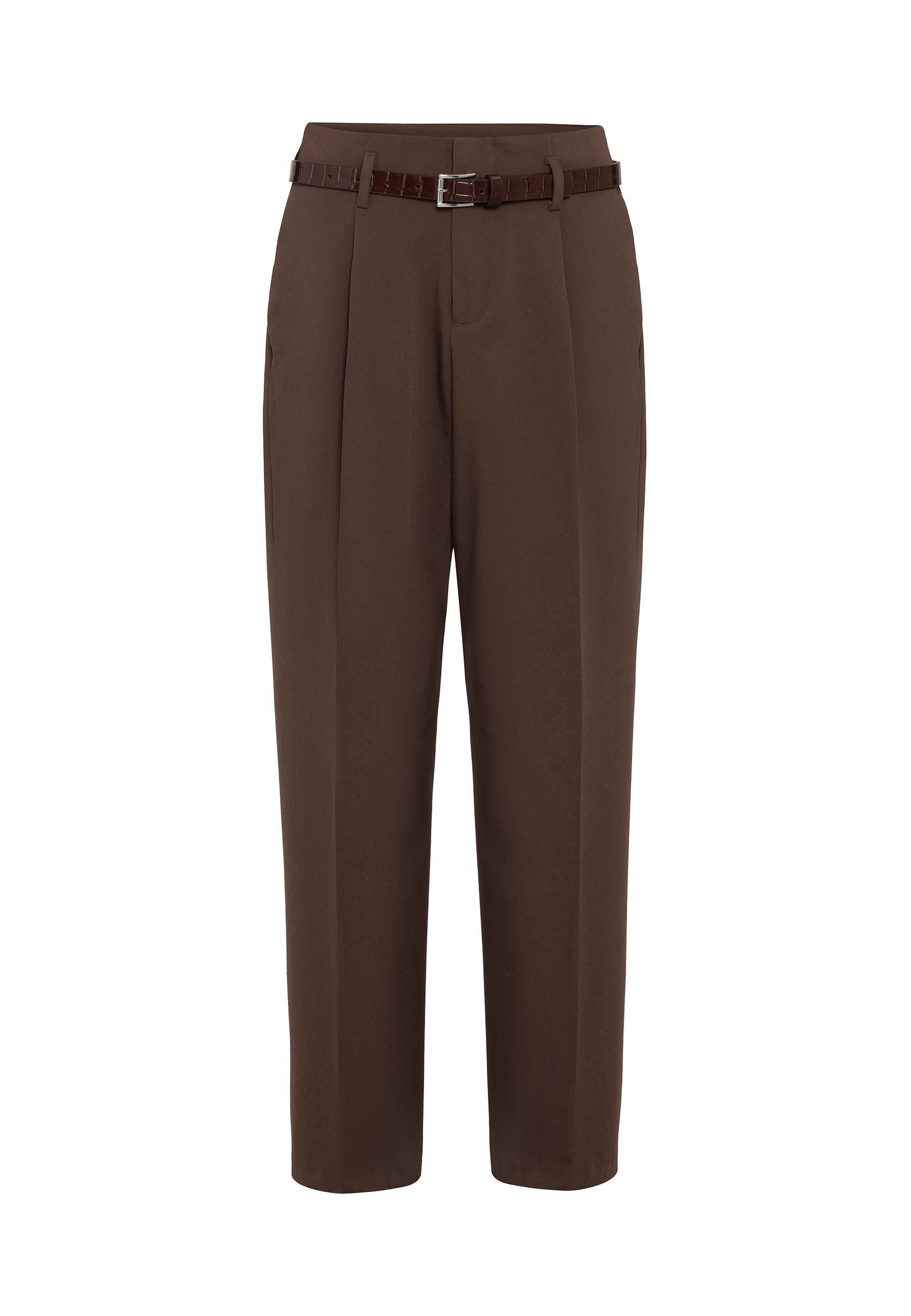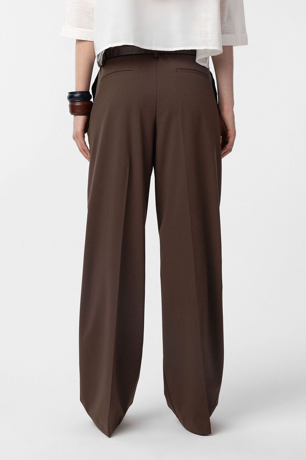 High Waist, Pleated, Loose-legged Trousers. Material 55% Polyester 40% Viscose 5% Elastane. Do not tumble dry, machine wash at 30°C. Our Model is 175 cm tall and is wearing size 36,