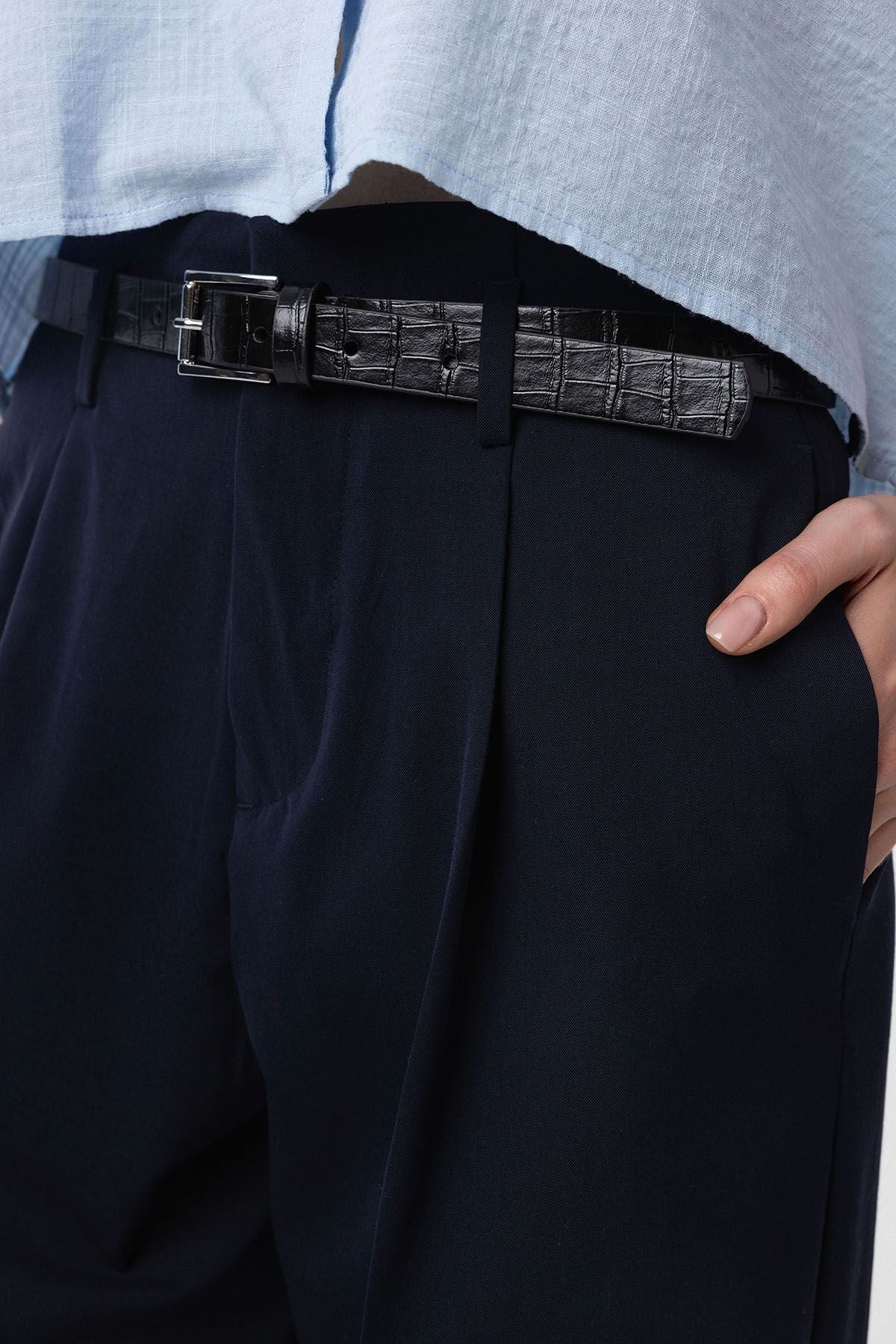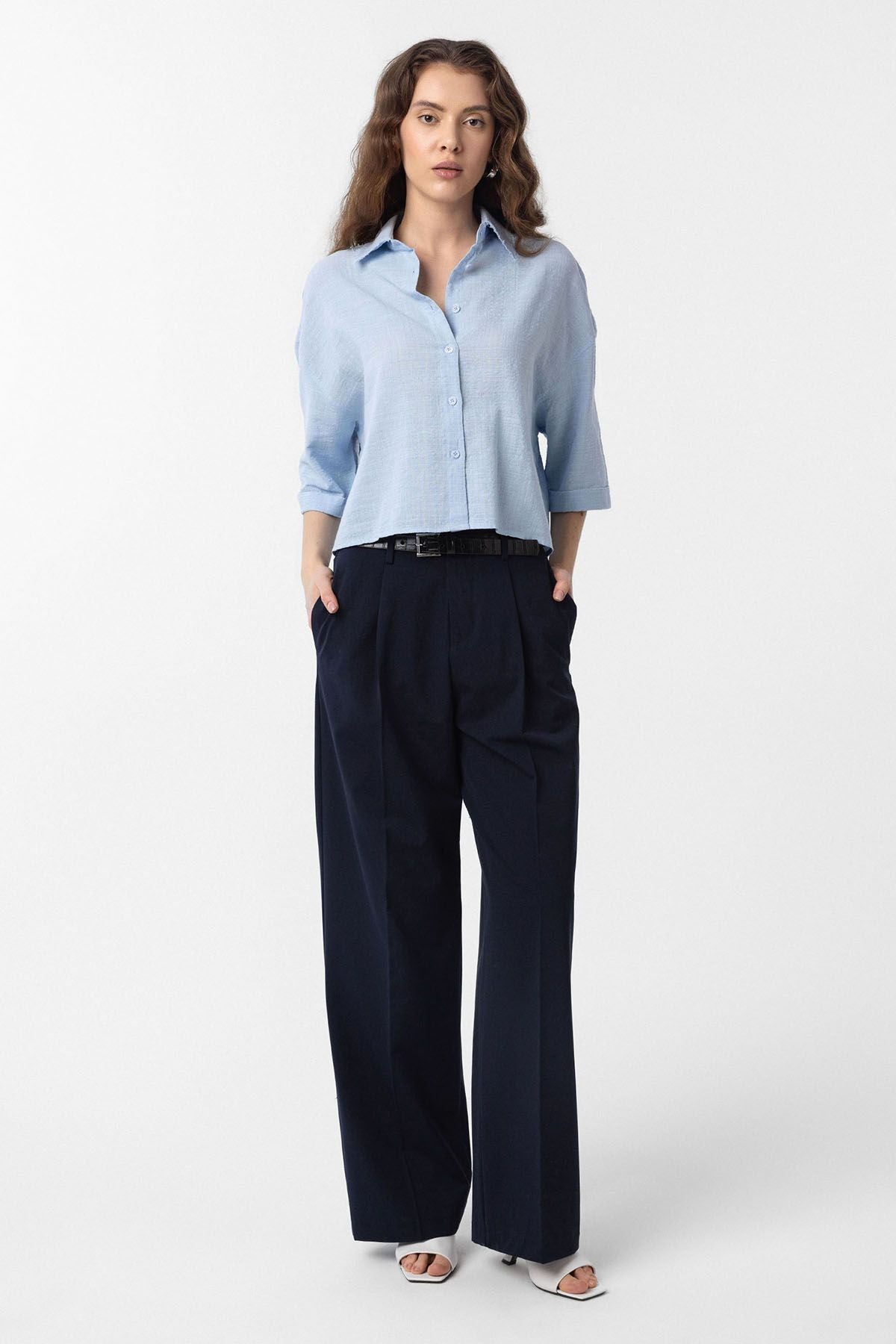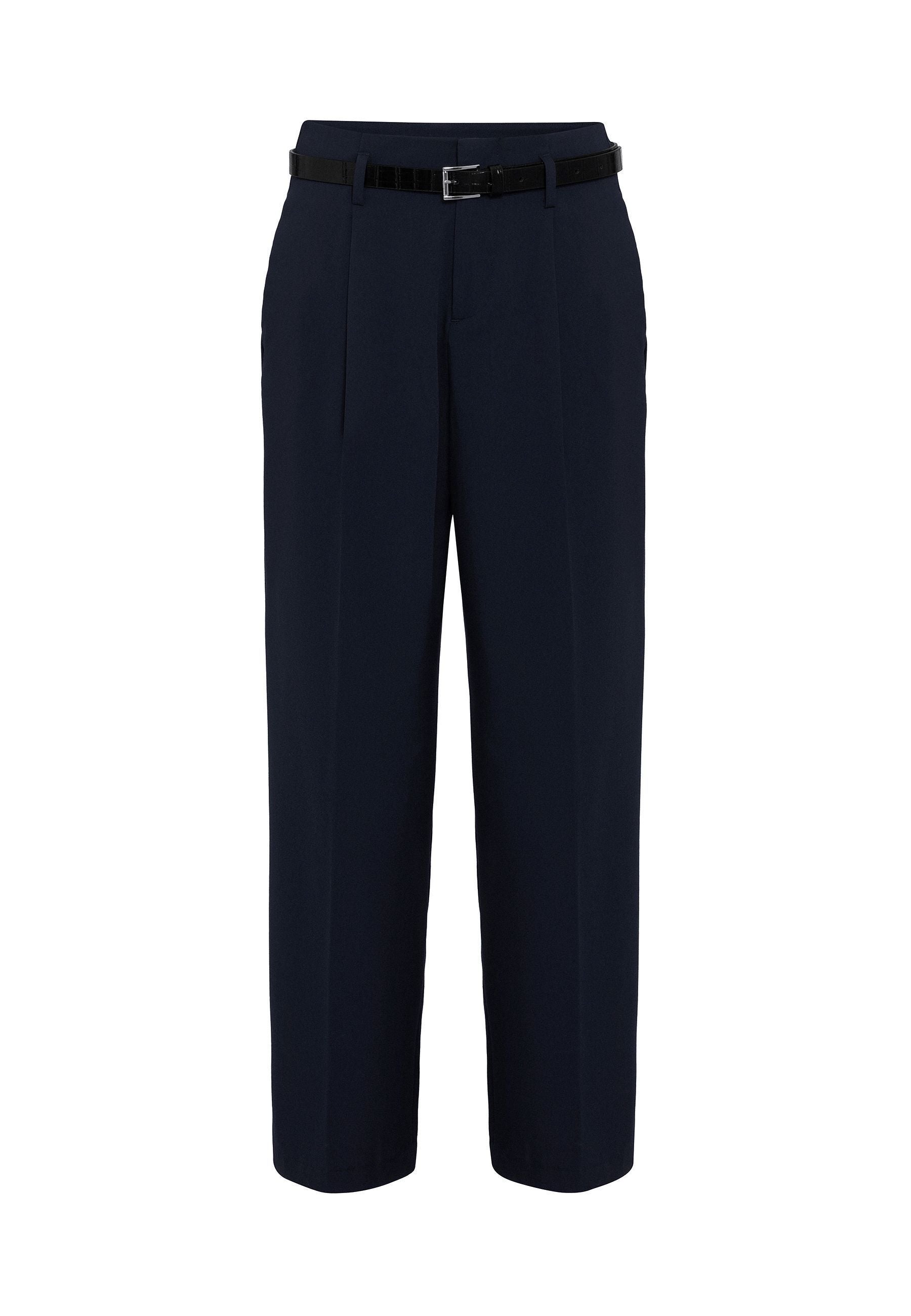 High Waist, Pleated, Loose-legged Trousers. Material 55% Polyester 40% Viscose 5% Elastane. Do not tumble dry, machine wash at 30°C. Our Model is 175 cm tall and is wearing size 36,