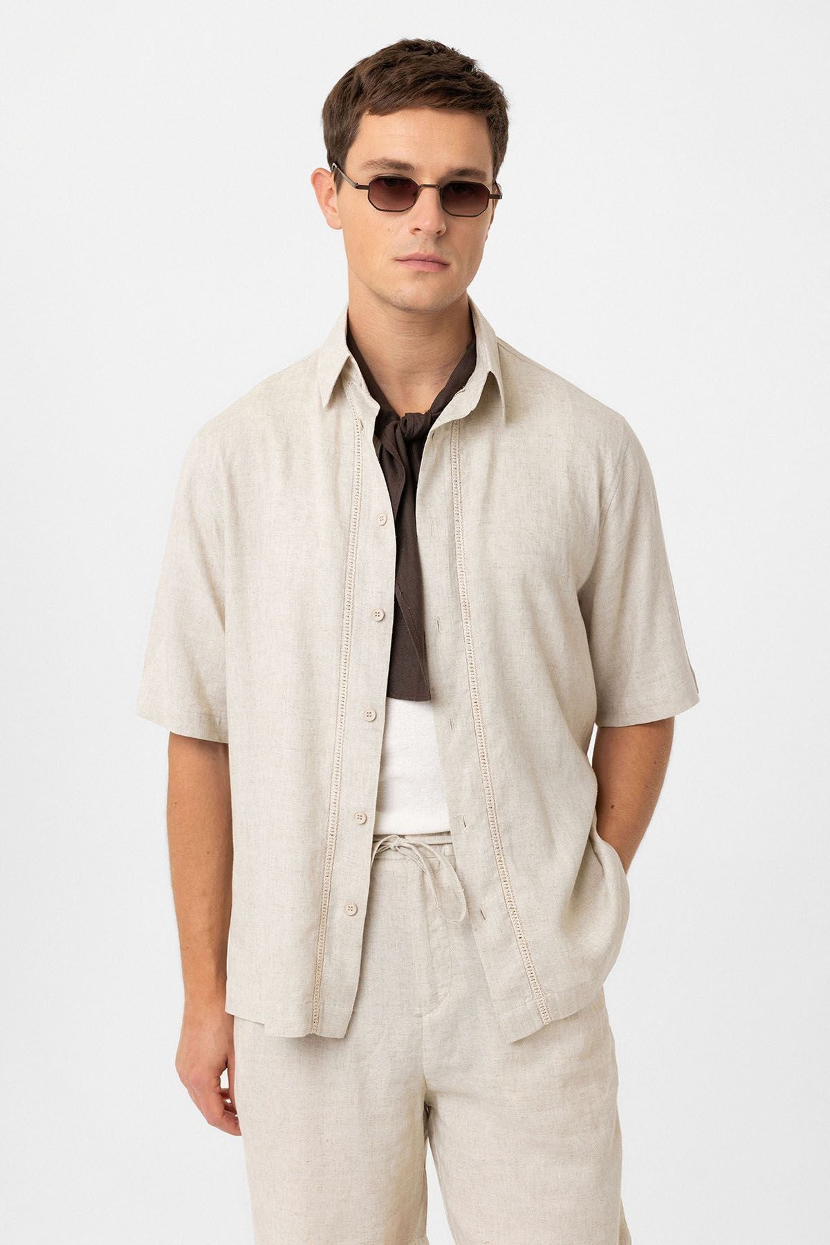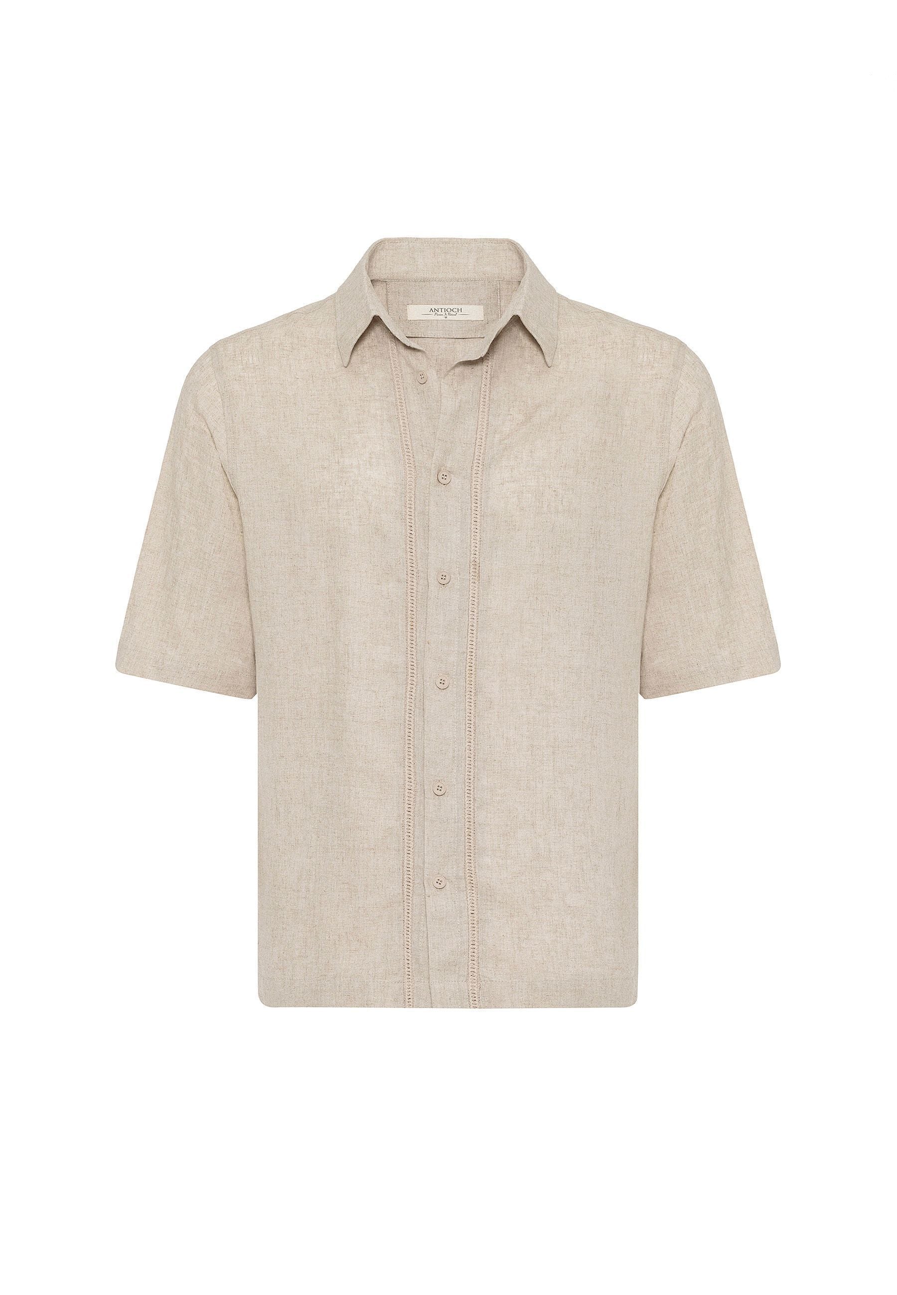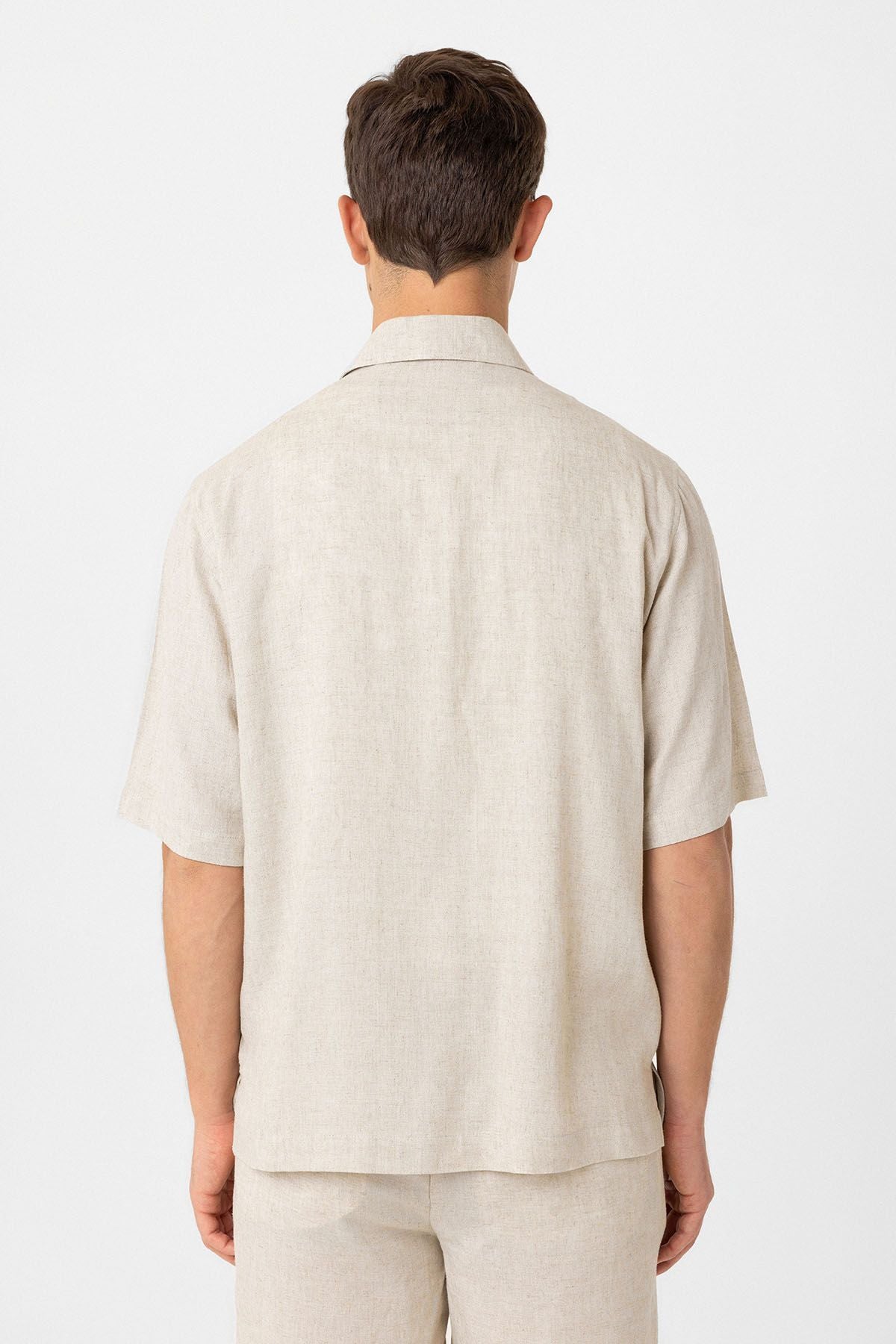 Short Sleeve, Kent Collar, Loose Fit Shirt. Material 50% Linen 50% Viscose. Machine wash at 30°C. Our Model is 186 cm tall and is wearing size M,