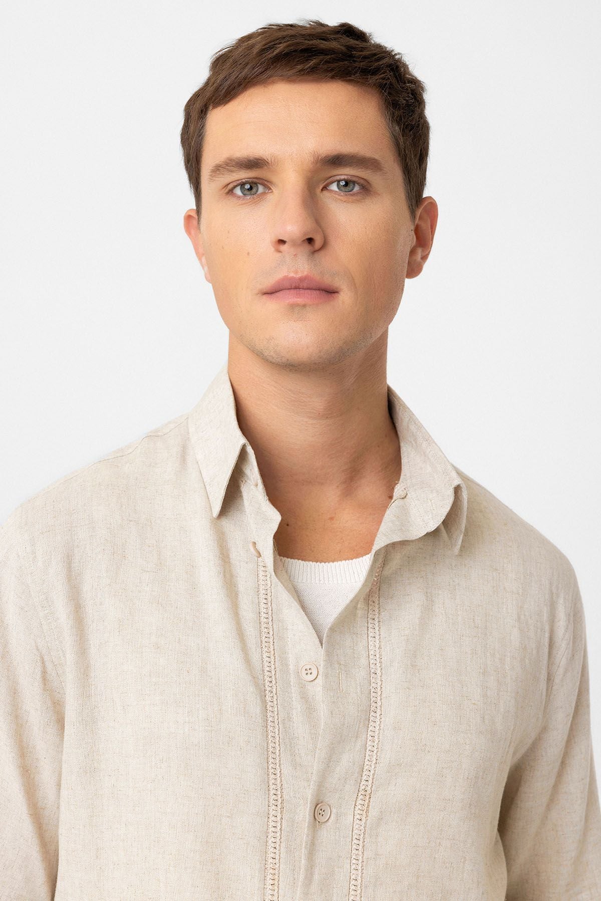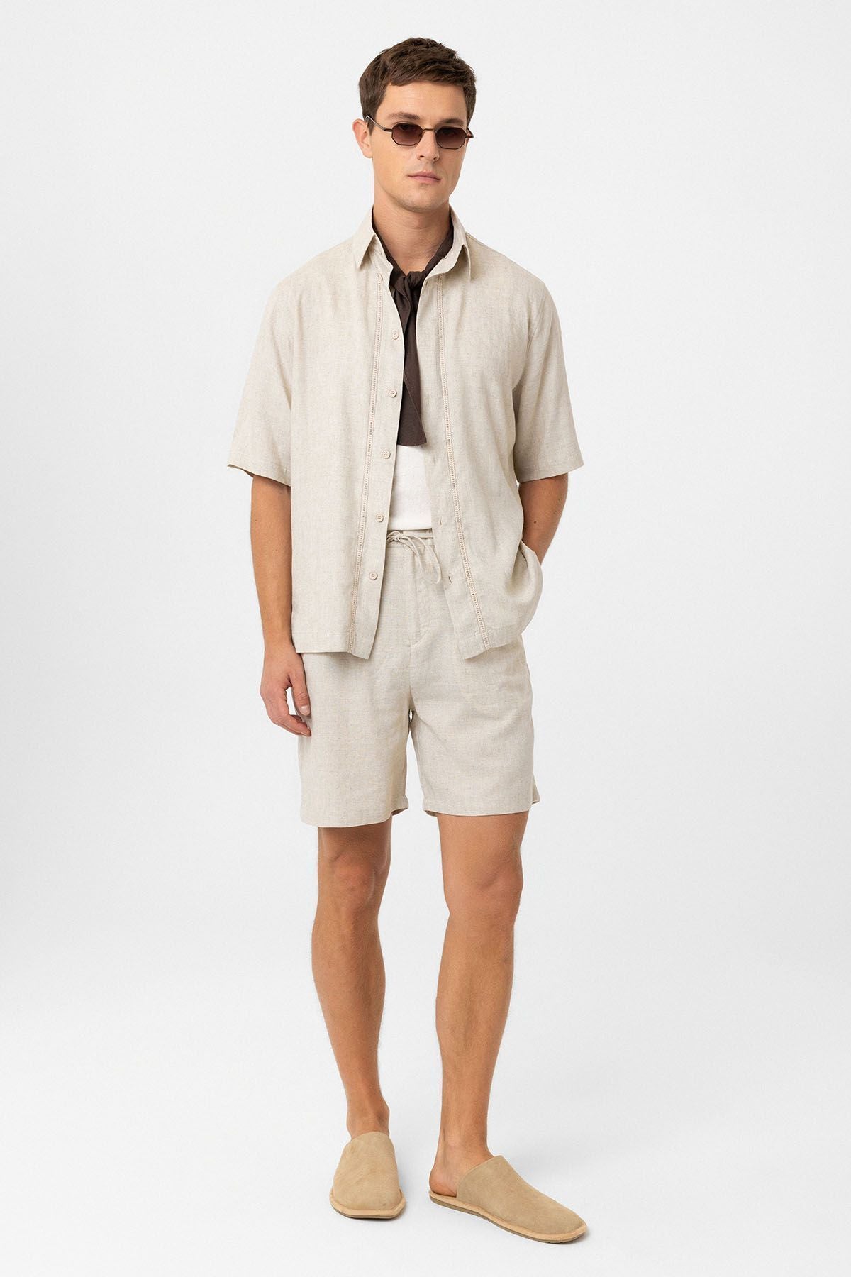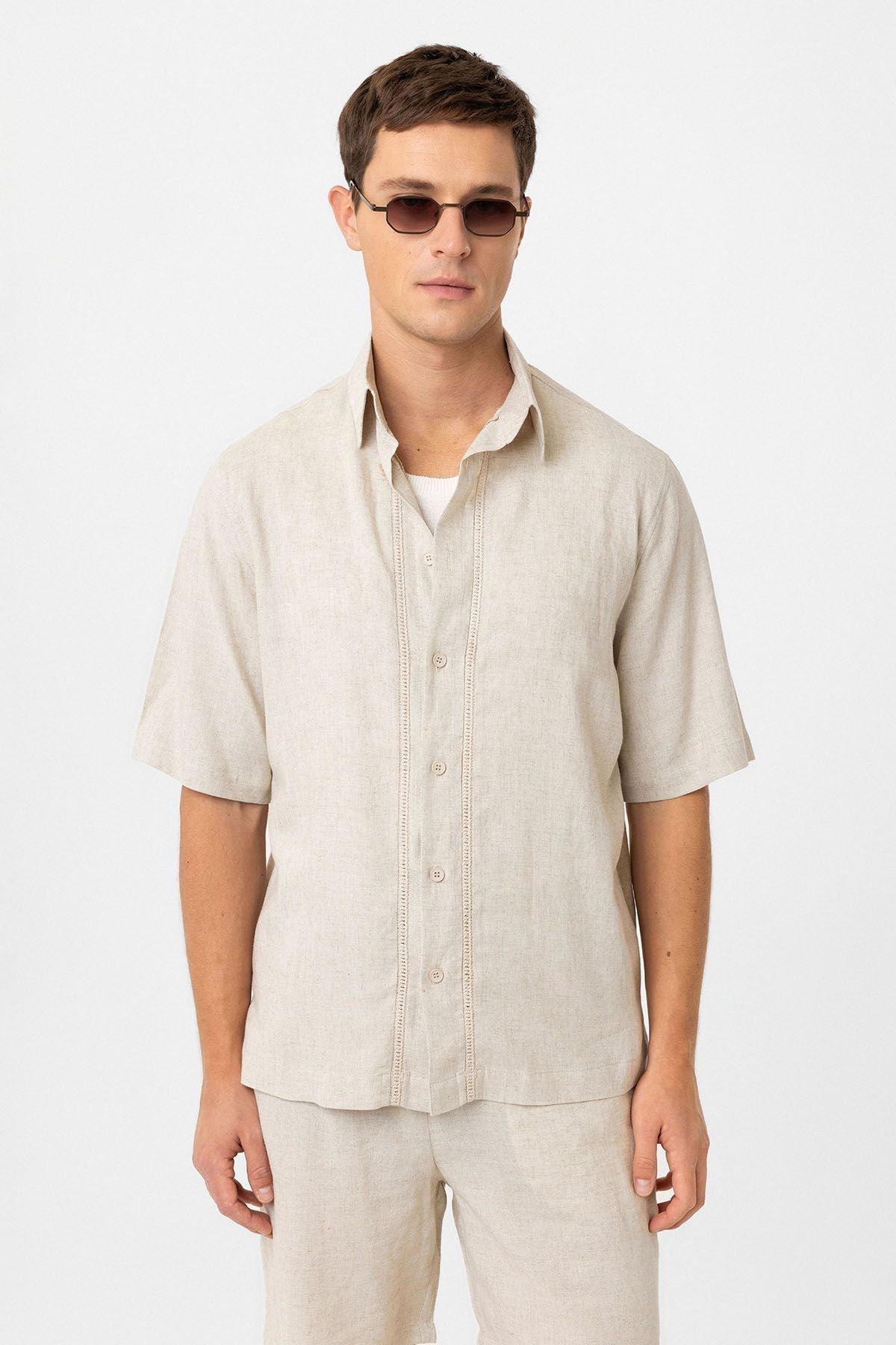 Short Sleeve, Kent Collar, Loose Fit Shirt. Material 50% Linen 50% Viscose. Machine wash at 30°C. Our Model is 186 cm tall and is wearing size M,
