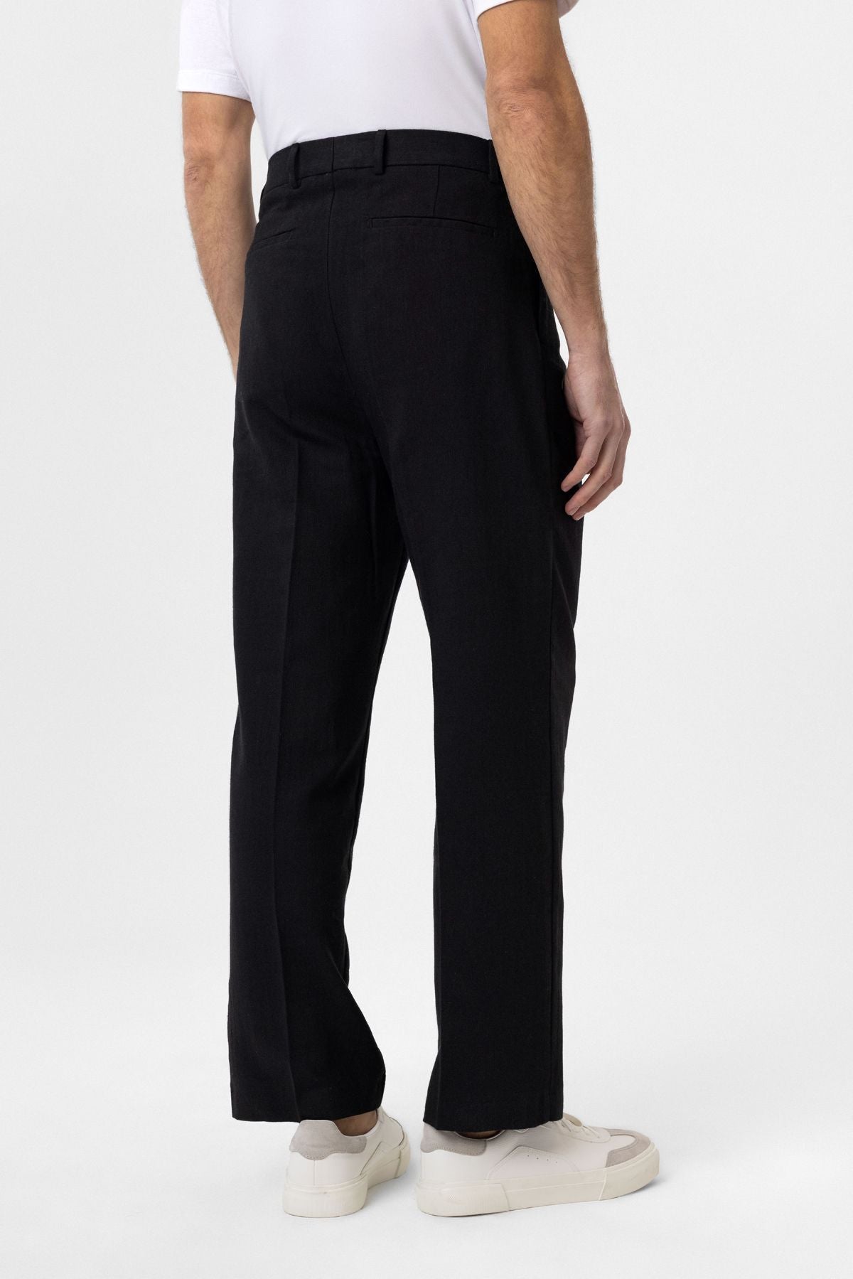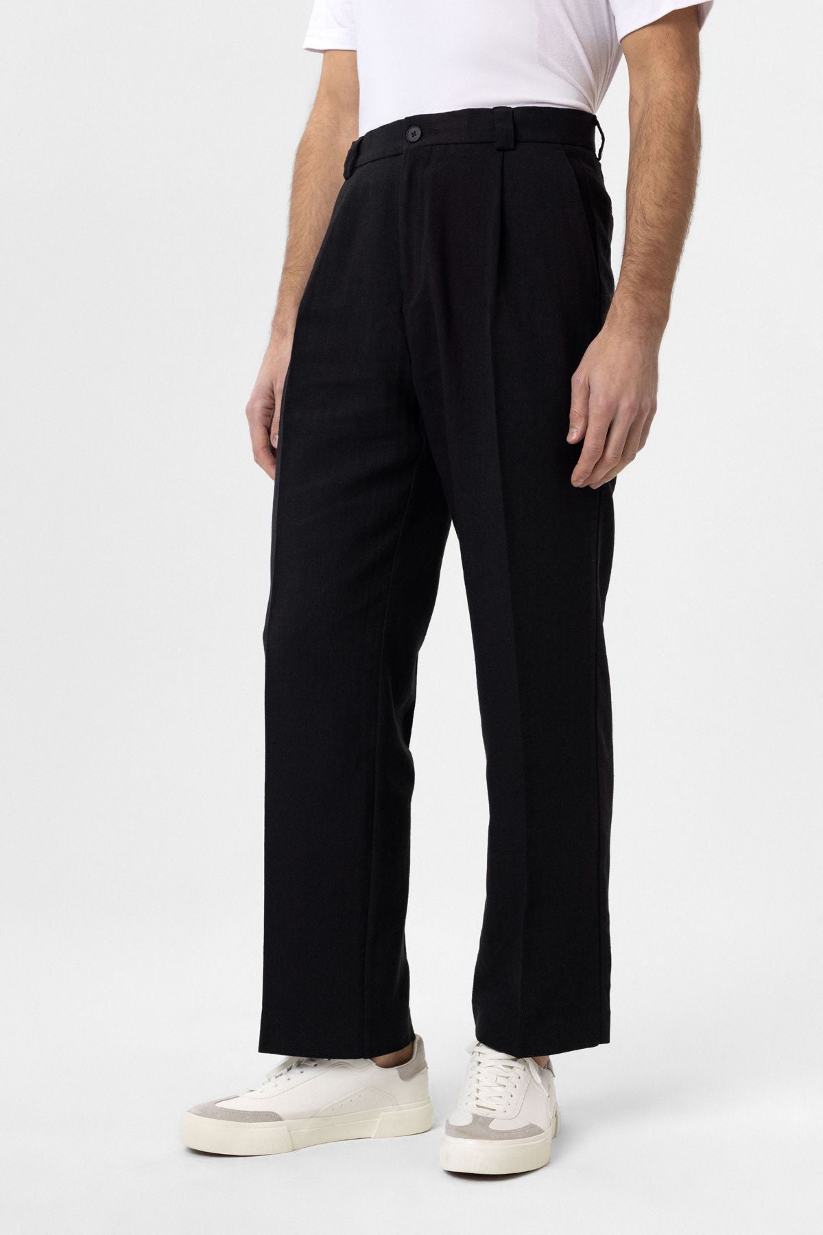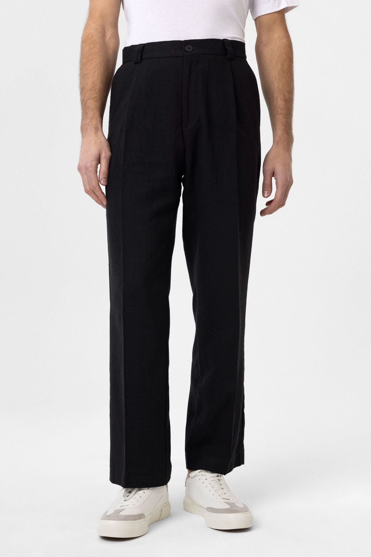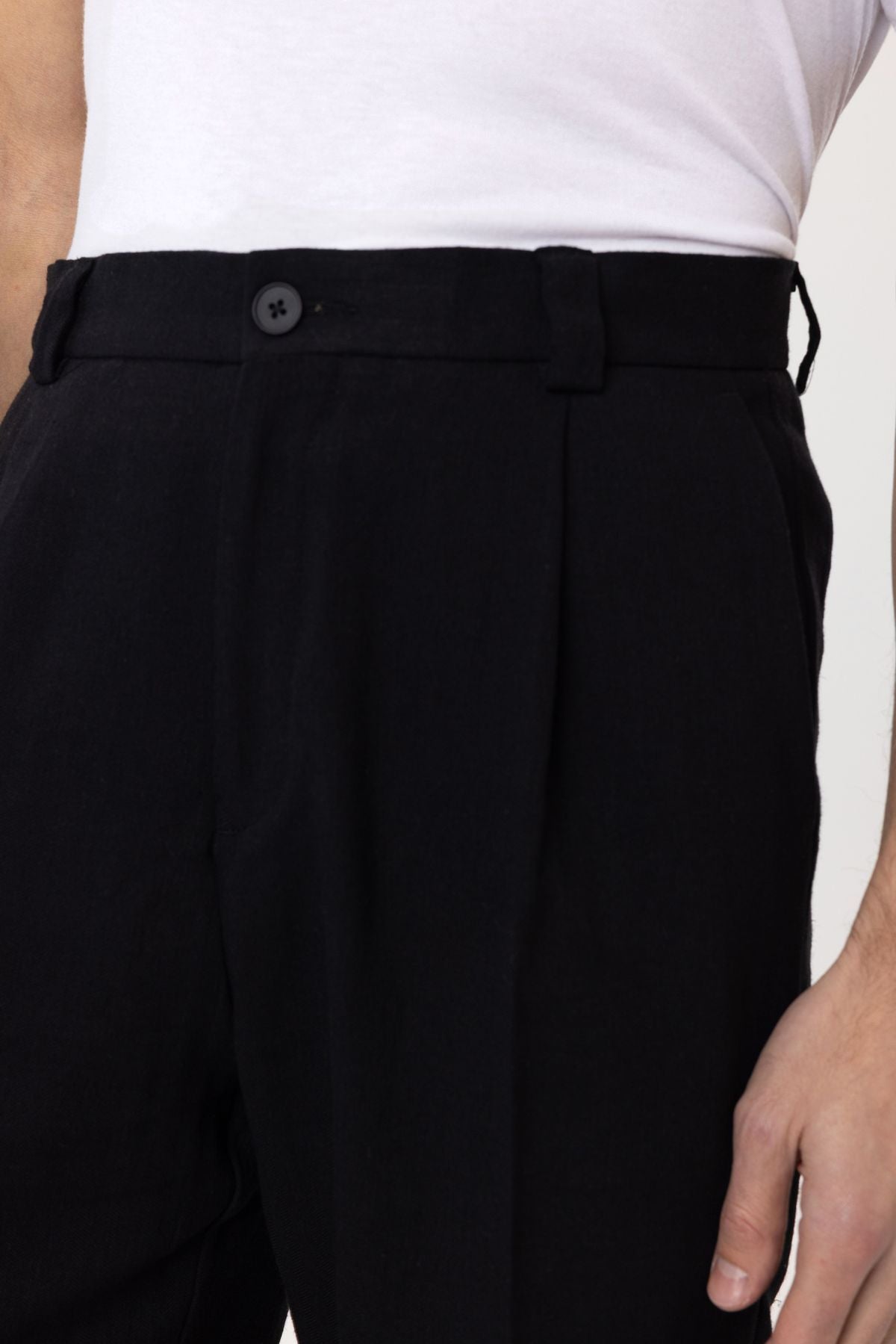 High Waist, Pleated Trousers. Material 46% Cotton 38% Viscose 16% Linen. Do not tumble dry, machine wash at 30°C. Our Model is 186 cm tall and is wearing size M,