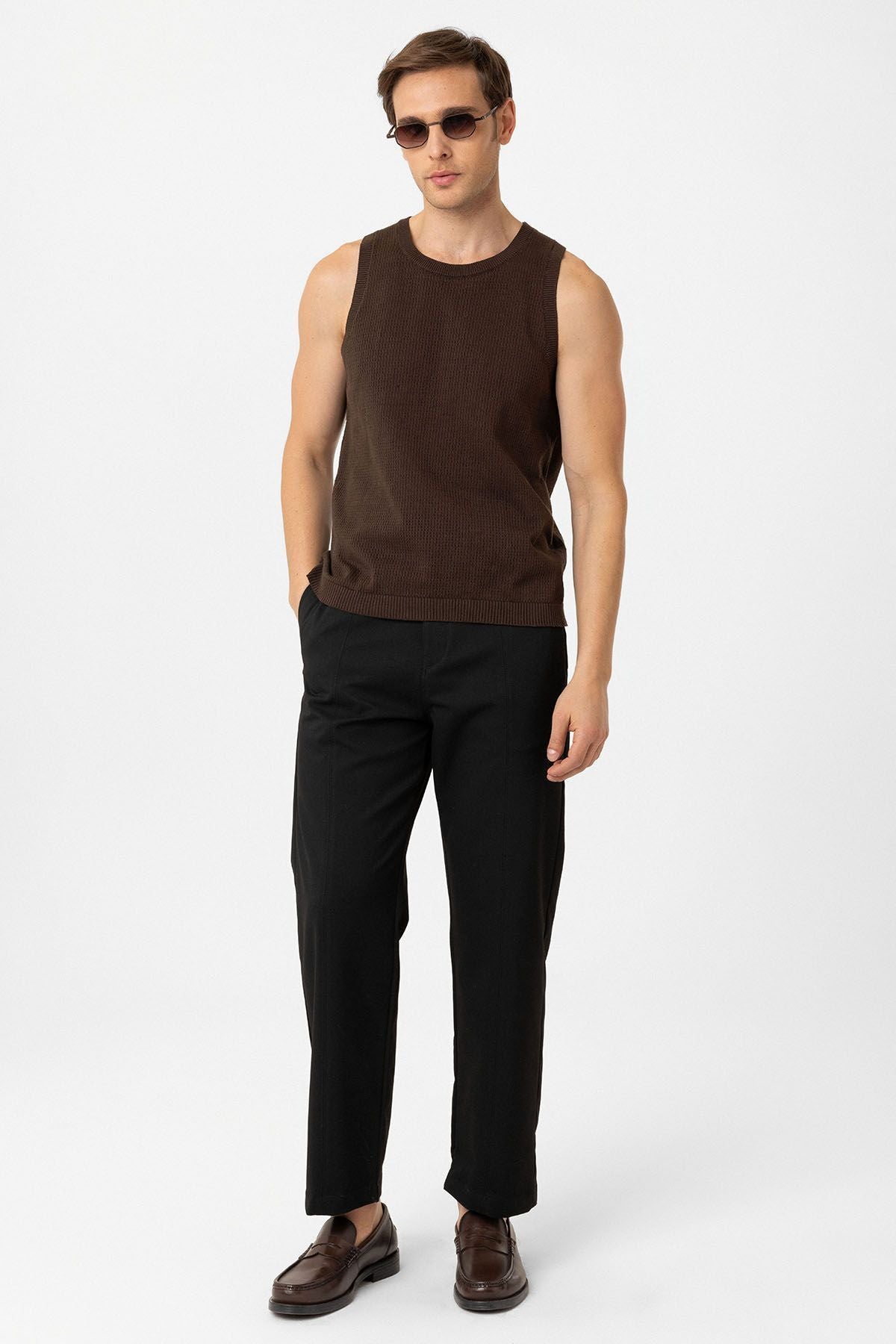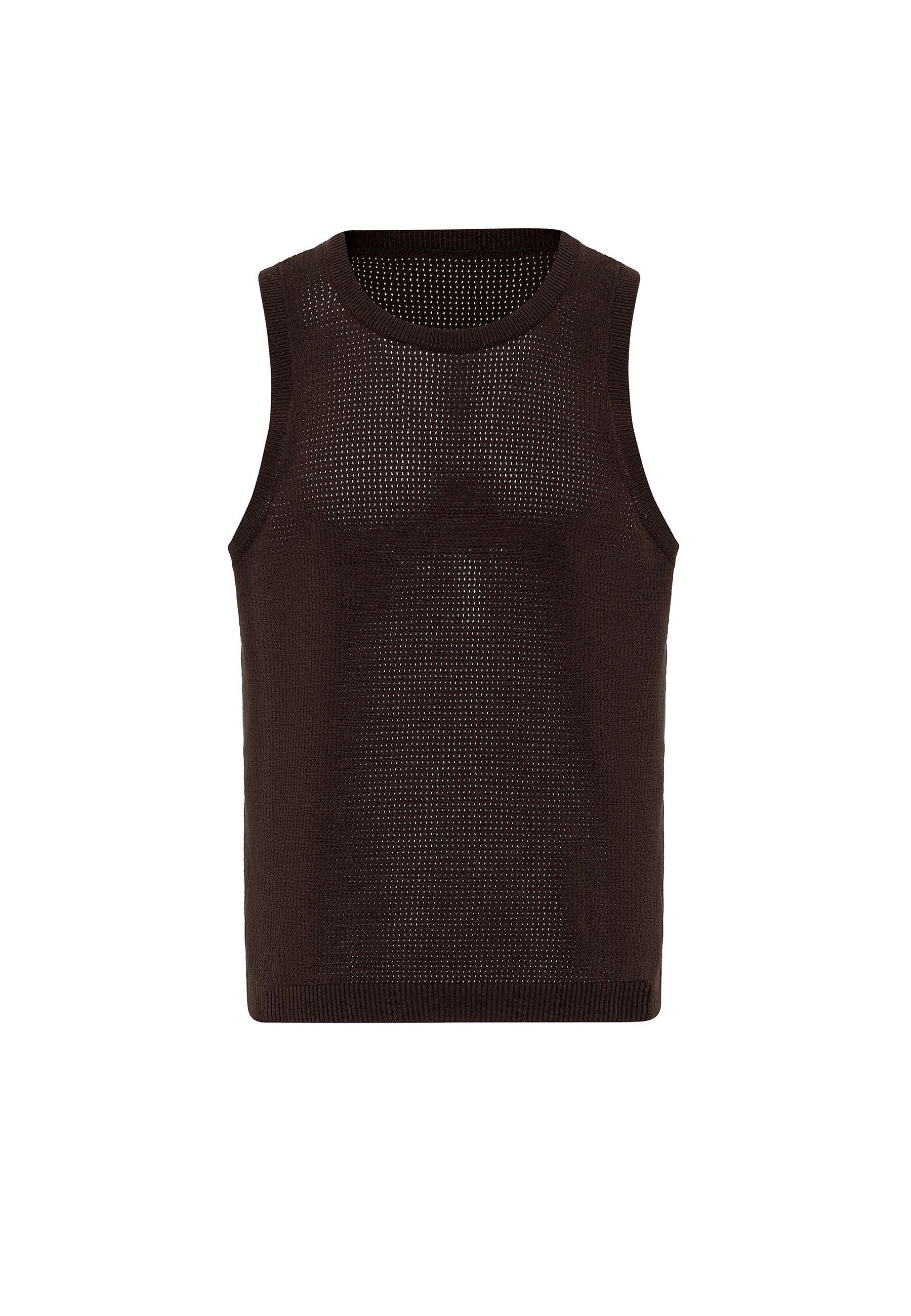 Sleeveless, Crewneck, Knitted T-shirt. Material 100% Cotton. Do not tumble dry, machine wash at 30°C. Our Model is 185 cm tall and is wearing size M